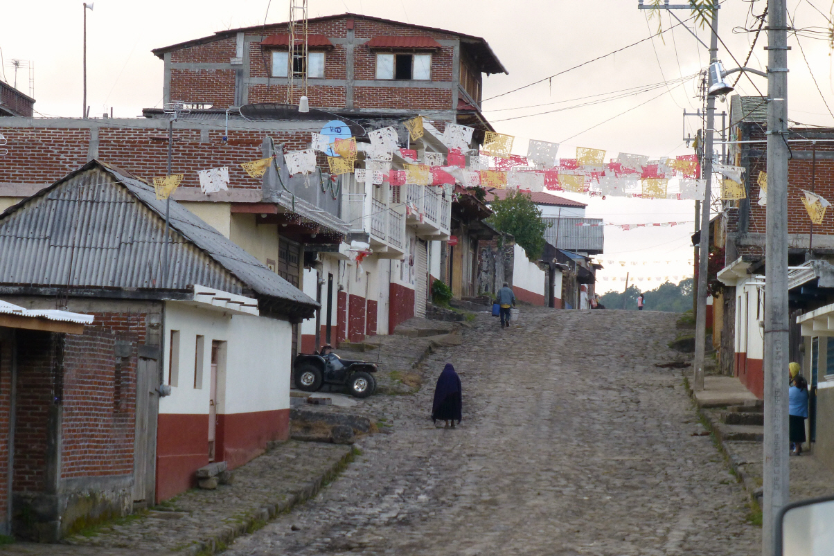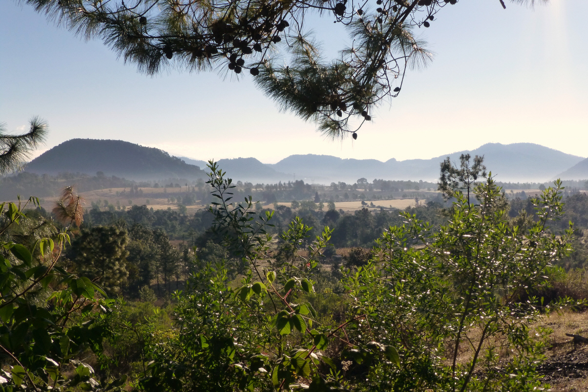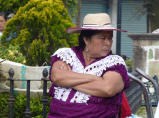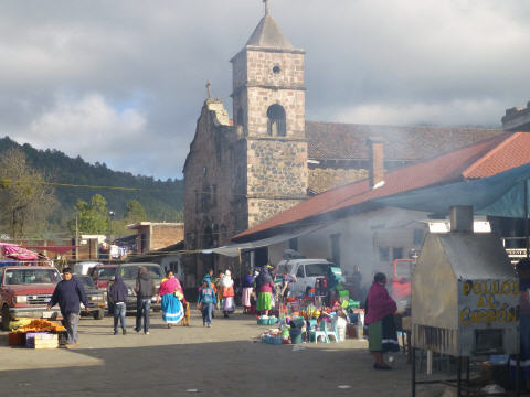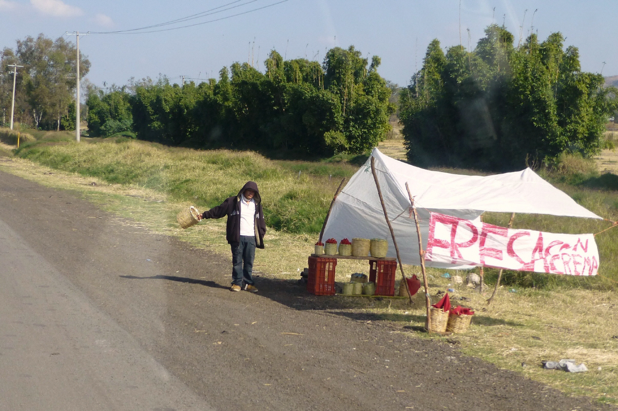 Was machen die Mexikaner am Morgen bei 9 C? Sicher nicht wie wir warm duschen! Von Zeit zu Zeit riecht man die Leute, obwohl sie äusserlich immer sauber daher kommen. Fahren durch eine Vulkan-Gegend. Die kleinen und mittleren, erloschenen Vulkane sehen aus wie gestürzte Backformen. Unterwegs sehen wir einen richtig schönen mexikanischen Markt, kaufen Früchte. Die Frauen tragen in dieser Region glänzende Plissé-Jupes, Blusen und Schürzen mit Pailletten und Bordüren.