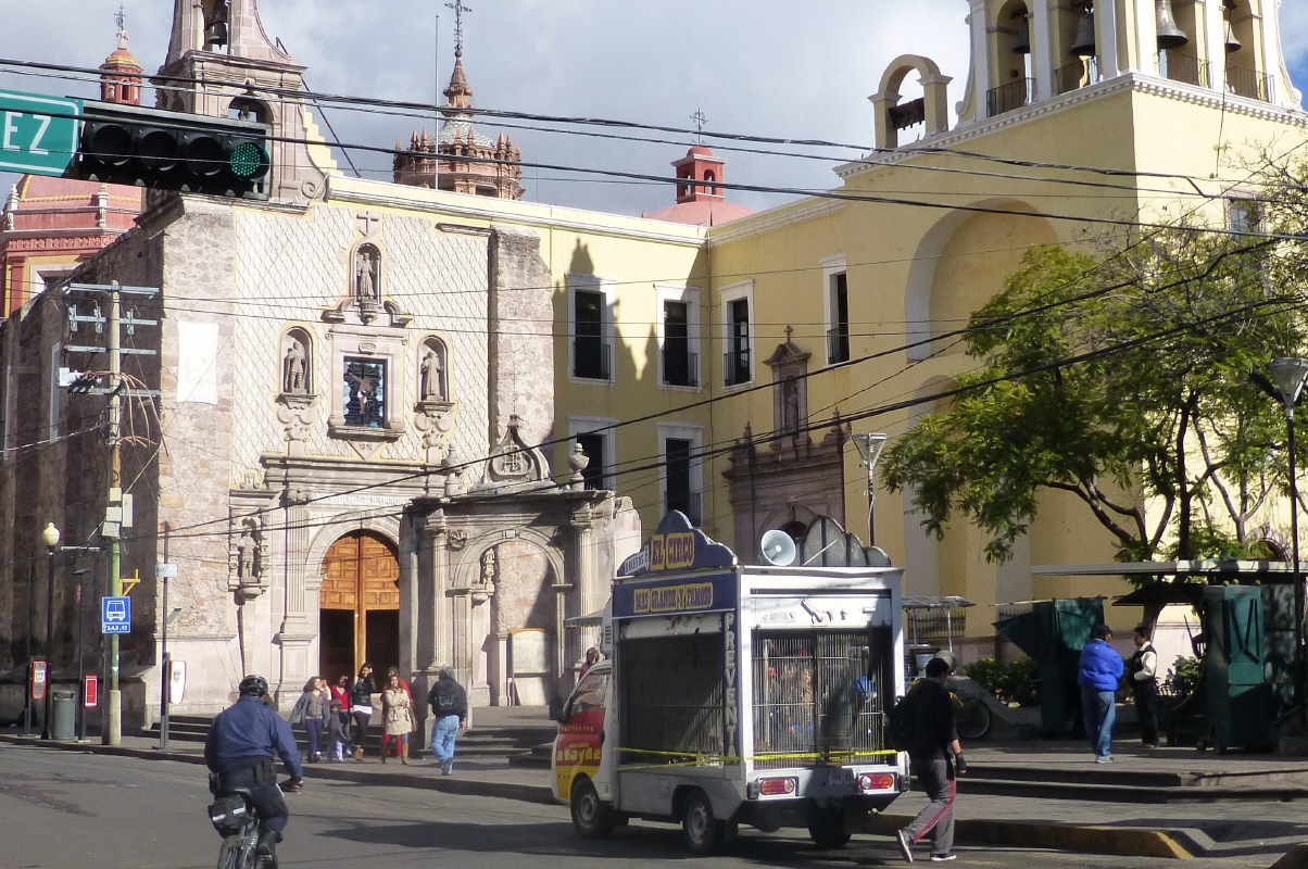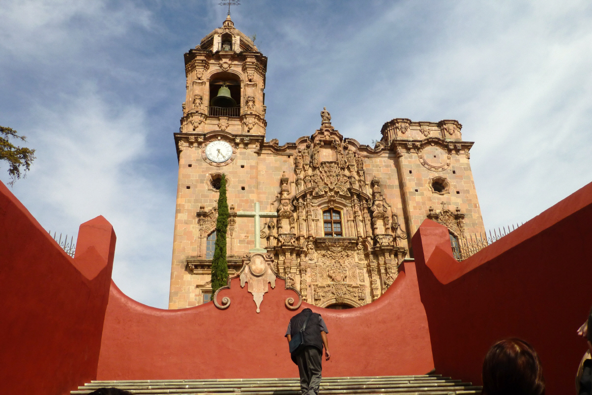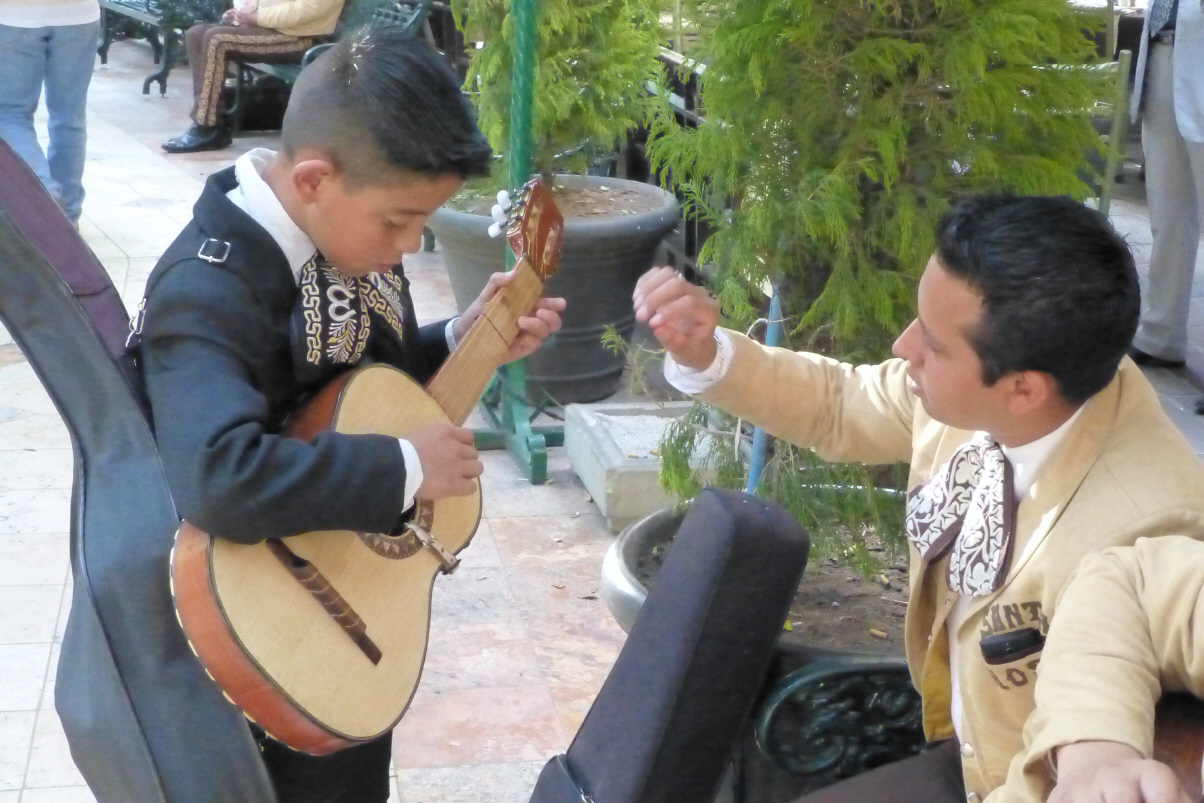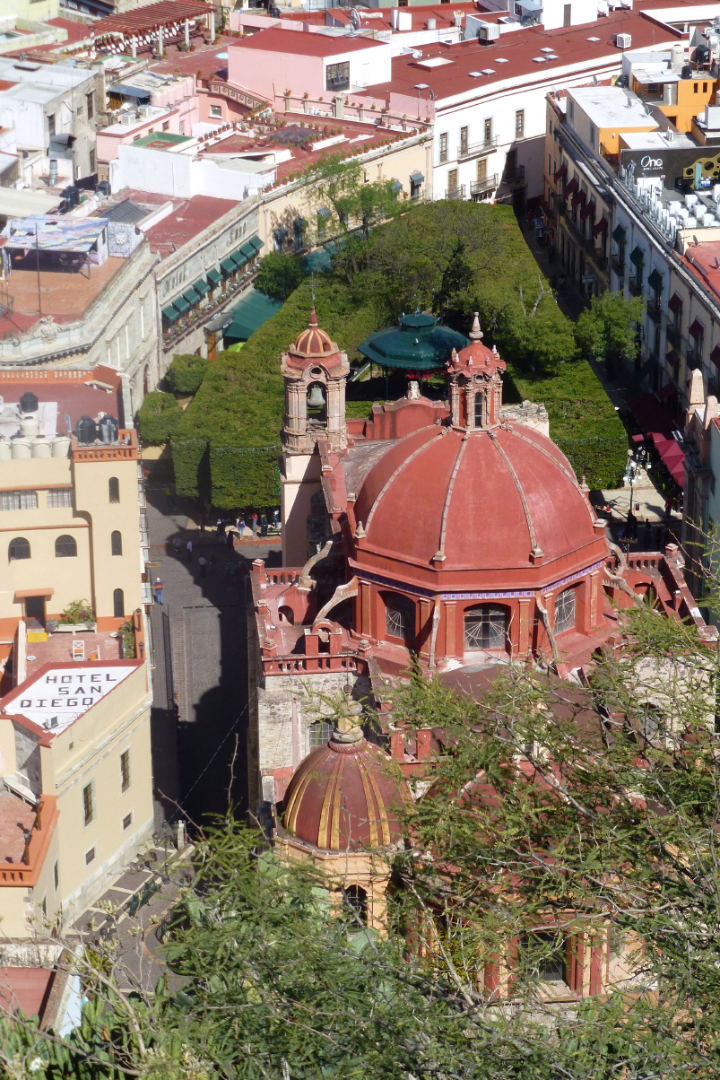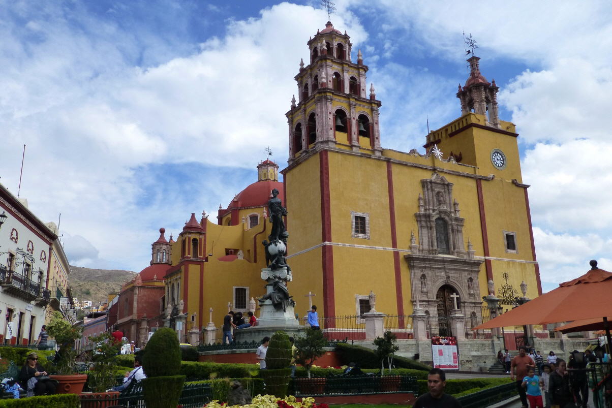 Bummeln zur ‚Basilica de Nuestra Seniora de Guanajuato‘. Hier im Zentrum ist viel los. Am ‚Jardin de la Union‘ sind viele Musikanten, die darauf warten, von den im Restaurant sitzenden Leuten zum Kauf von Musikstücken aufgefordert zu werden. Mit viel Inbrunst wird Trompete, Handorgel, Geige und natürlich alle Grössen Gitarre gespielt. Jede Gruppe hat ihre eigene Uniform. Die Hosennähte werden durch Silber/Goldschmuck zusammen gehalten.