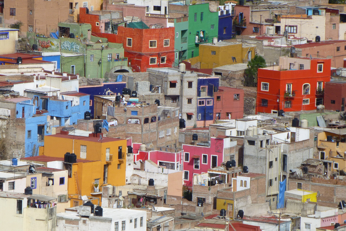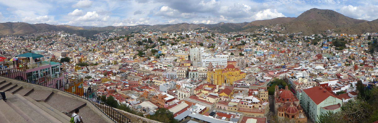 Fahren über die Panoramastrasse zum ‚Monumento Pipila‘. Von hier oben hat man einen schönen Bilck über die bunte Stadt mit den vielen Gassen, Kirchen und der Universität. Die Citytour endet mit einer sehr, sehr steilen Schussfahrt durch die engen Gässchen mit scharfen Kurven in die Stadt hinunter. Es ist soooo steil, dass man sich in einer Achterbahn fühlt. Auf jeden Fall kreischen die einen. Verabschieden uns von den anderen Fahrgästen mit denen wir uns angefreundet haben. Als Schweizer resp. Europäer sind wir schon Exoten.
