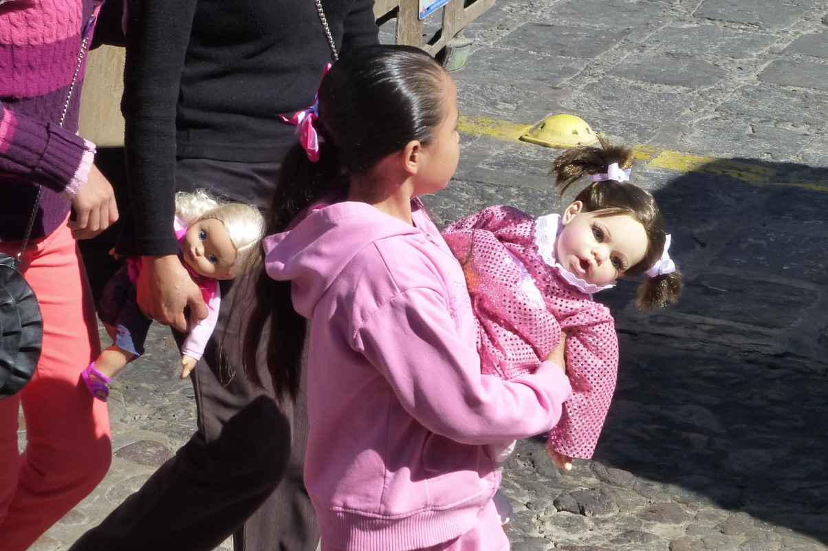 Auf dem Markt haben wir einen kleinen ‚Drei Königskuchen‘ gekauft‘. Die Grossen haben einen Durchmesser von 50 cm und 4 Könige. Sehr praktisch für eine Familie! Beim Auspacken des trockenen Gebäcks sieht Bigi den König bereits. Sie nimmt ihn heraus und steckt ihn mit geschlossenen Augen in den Boden des Kuchens - Kaspar wird König! Sein Reich ist jedoch sehr klein, da die Königin ihm nicht besser als an den anderen Tagen im Jahr gehorcht. Der König ist ein kleines Kind aus Plastik. Mit dem öffentlichen Bus, der heute rappel voll ist in die Stadt. Die Kinder schleppen alle ihre neue Puppe, Auto und dergleichen mit. Im Park wird altes Spielzeug gesammelt, das vermutlich später am Tag von den Königen an ärmere Kinder verteilt wird. Einige Kinder trennen sich nur unter Tränen von ihren alten Spielzeugen.