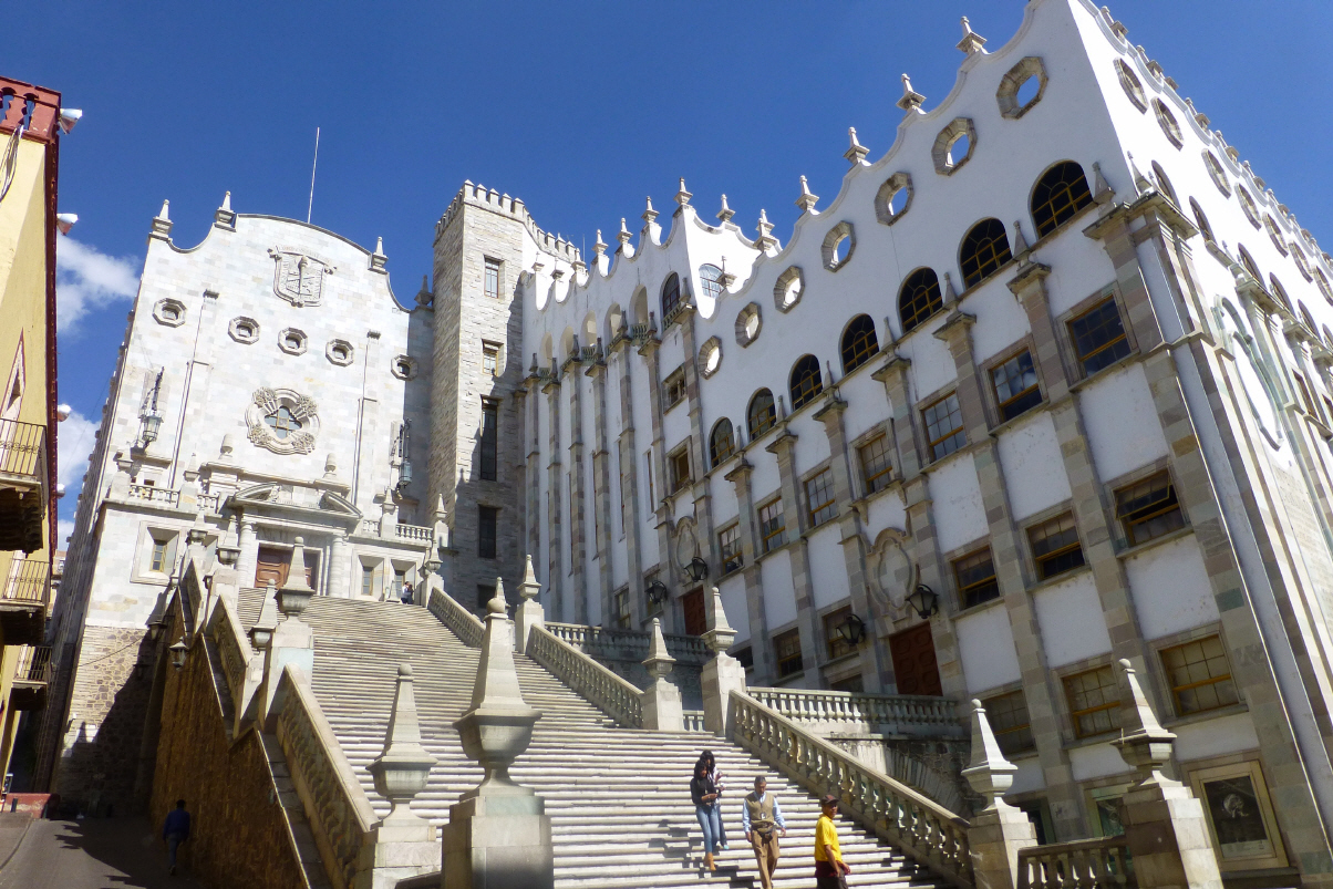 Schlendern am ‚Hidalgo Museum‘ vorbei zur imposanten Universität. Es ist eine spezielle Architektur mit vielen Zinnen und einer 80 Stufen Treppe.