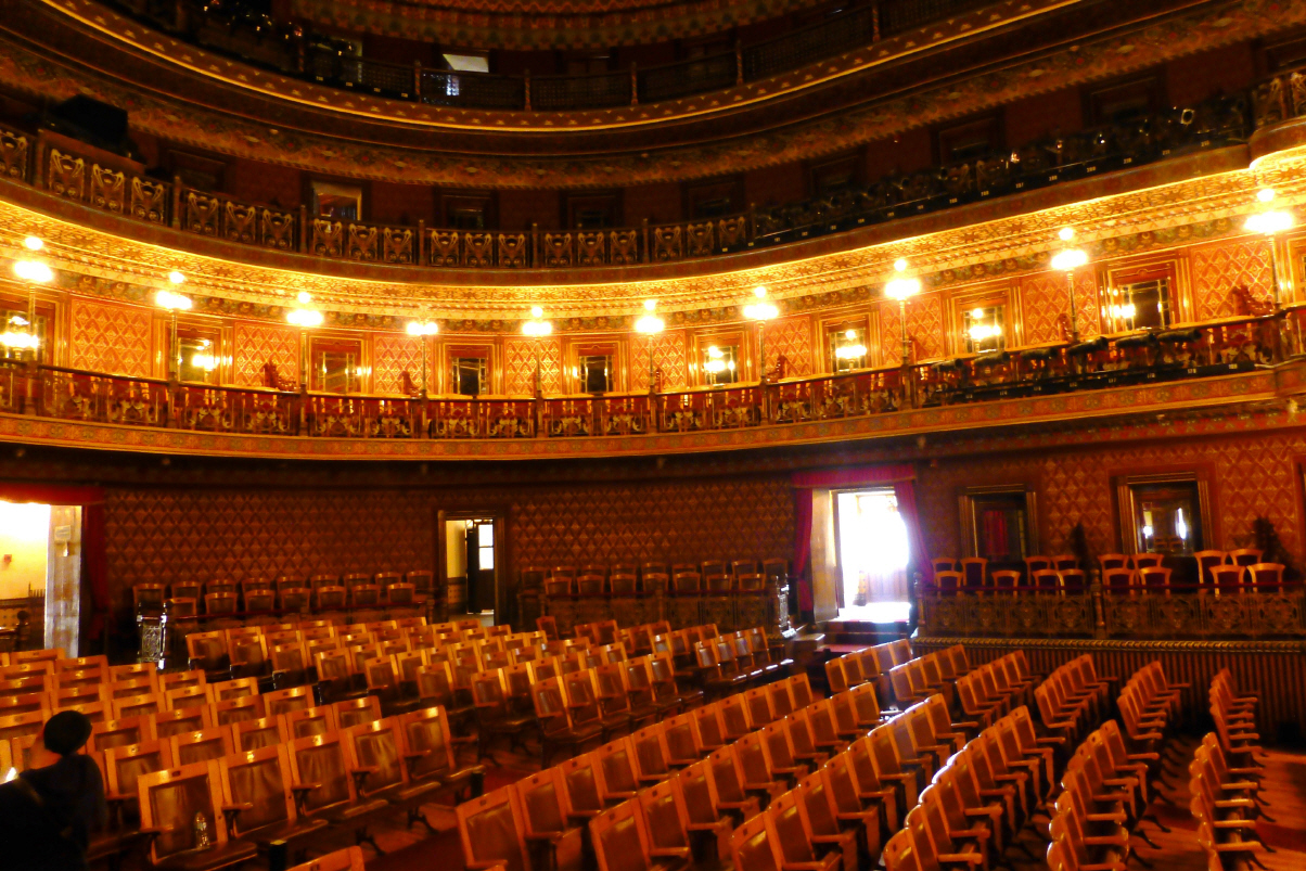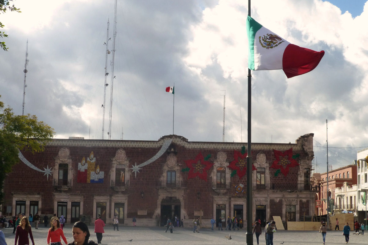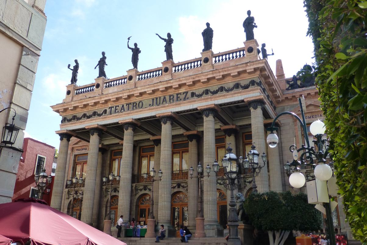 Möchten das wunderschöne im 1903 gebaute ‚Teatro Juárez‘ mit 1200 Sitzplätzen besichtigen. Hier muss man wieder einmal für’s Fotografieren bezahlen, jedoch ausdrücklich ohne Blitz. Der Saal ist ein wunderschöner Bau mit Historismus- und Art Deco Elementen. Die Tapeten in Rot/Gold und die Geländer aus Schmiedeisen. Hier findet im Oktober jeweils das internationale ‚Cervantes e Don Quijote-Festival‘ statt, das 40‘000 Besucher aus ganz Mexiko anzieht.