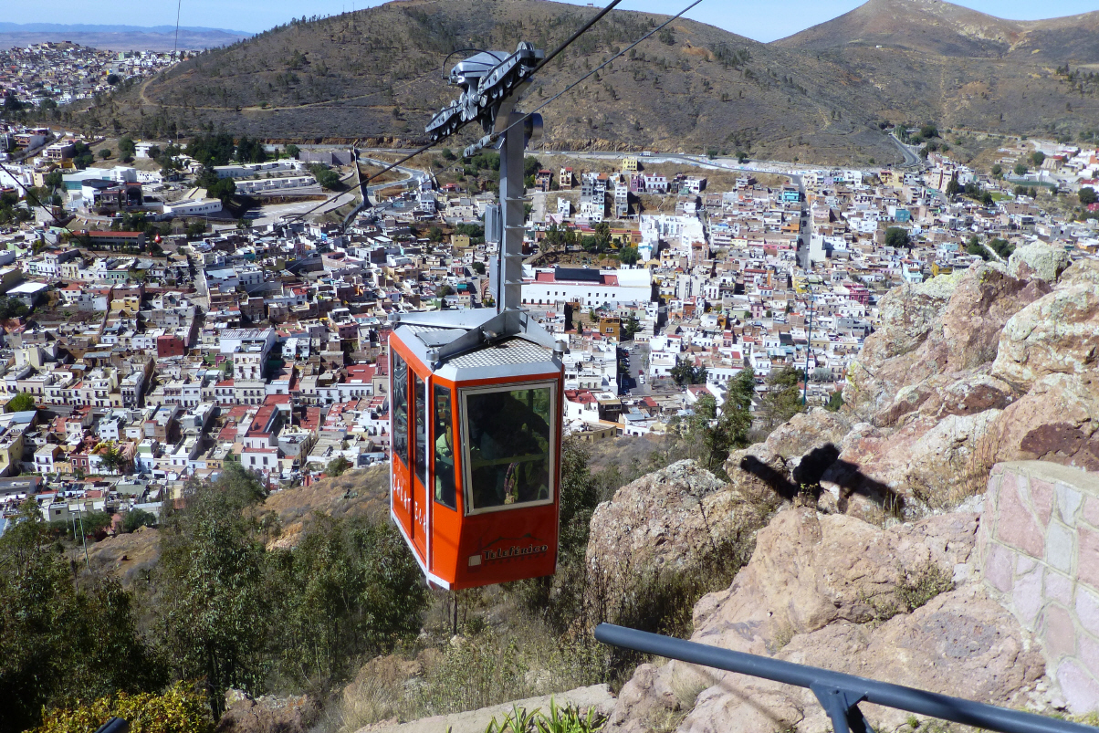 Es war eine lange, laute Nacht. Nicht nur die Autobahn vor der Hacienda ist lärmig, sondern hinter dem Hotel fahren auch noch die langen, schweren Güterzüge. Mit dem Taxi ins Zentrum. Hier wird gerade eine Stadtrundfahrt angeboten. Nehmen die 3-stündige Tour. Wir sind alleine mit dem Guide. Verständigen uns in Englisch und Spanisch. Früher gab es hier 12 Silber-/Goldminen, wovon heute noch in fünf gearbeitet wird. Die Kanadier managen alles und haben die Abbau-Konzession von der Regierung gekauft. Auf dem Weg zum ‚Cerro de la Buffa‘ erklärt der Guide viel über die Geschichte der Stadt. Er zeigt uns auch noch ein spezielles Gras, welches ‚Zacateca‘ heisst. Auf dem Berg ist eine Kapelle mit einem schönen Innenhof. Werden durch laute Musik, das ‚Ave Maria‘ stielvoll empfangen. Schöne Aussicht über die farbige Stadt. Mit dem ‚Teleférico‘, einer 30 Jahre alten kleinen Kabinenbahn aus der Schweiz, zum gegenüberliegenden Hügel ‚Cerro del Grillo‘. Kurze Fahrt zur 1960 stillgelegten ‚Mina el Edén‘.