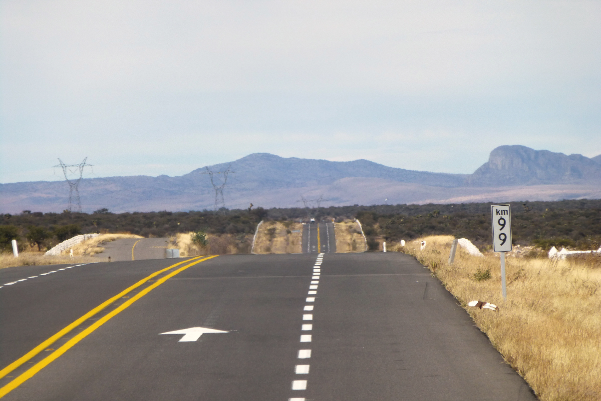 Wir waren gestern die einzigen Gäste im Restaurant und es war sehr kalt, da das Gas für die Heizung ausgegangen war. Das Essen war nichts Besonderes und hat uns die ganze Nacht geplagt. Nun haben wir genug von den Kolonialstädten im kühlen Hochland und wollen nur noch runter an den Pazifik an die Wärme! Via ‚Fresnillo‘ nach ‚Durango‘.