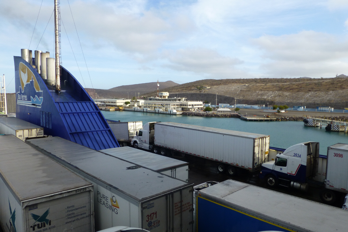 Checken, ob die Fähre TMC heute fährt. Ja es ist so, müssen aber sofort aufbrechen. Wir sind schon ein wenig Mexikaner und nehmen uns die Zeit zum Tanken und Einkaufen. Dann zum Fährhafen. Die Fähre ist bereits in Warteposition. Zuerst wird der MAN gewogen: 10‘700 kg inklusive Driver. Im TMC-Büro rechnen sie für uns den Preis für die Überfahrt nach ‚La Paz‘ aus. Sogar der Chef kommt nach vorne und es wird hin und her diskutiert. Nun sollen wir inklusive einem Passagier sage und schreibe 15‘300 Pesos bezahlen - CHF 1‘070! Dies ist uns eindeutig zu viel. Fürs Wohnmobil soll man doppelt so viel bezahlen wie für einen LKW gleicher Grösse/Gewicht. Es ist überhaupt die höchste Klasse – dies empfinden wir als ‚Touristenabzocker‘! Wir sagen ‚NO‘ und laufen davon. Wir haben beschlossen, die 400 km bis zum Hafen ‚Topolobampo‘ die Küstenstrasse hoch zu fahren. Von dort kostet die Überfahrt rund die Hälfte und dauert auch nur 8 Stunden.
