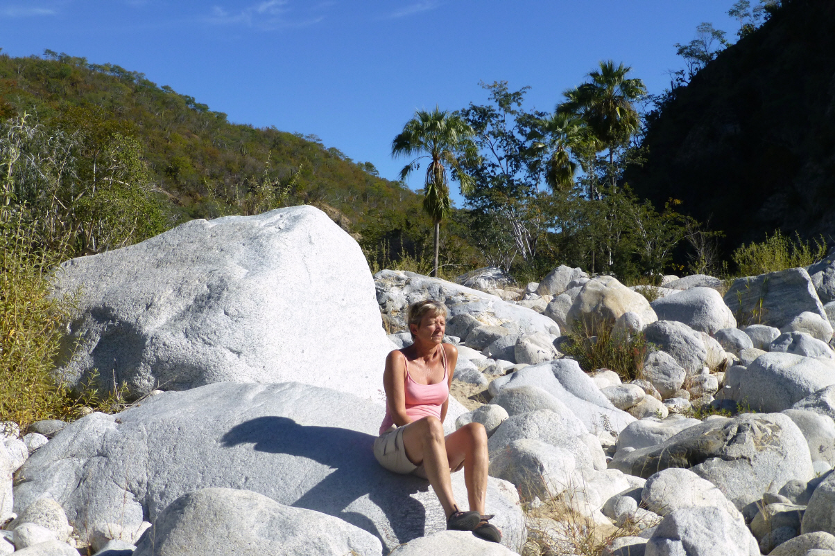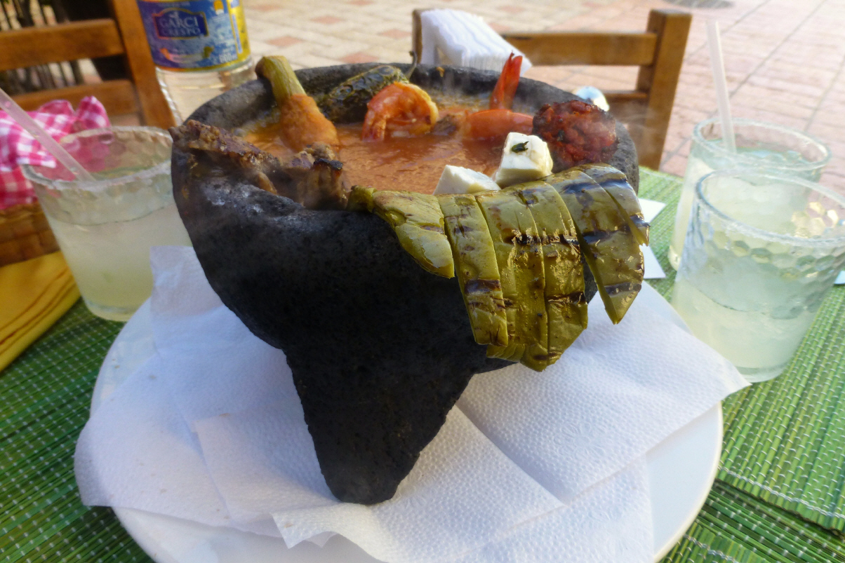 Zuerst in den Pool, brrrr! Beim Frühstück friert Kaspar an die Füsse. Nach einiger Zeit merkt er, dass er nur eine Socke angezogen hat. Mit dem öffentlichen Bus in die Stadt. Heute Sonntag fährt anscheinend nur alle Stunde ein Bus. So warten wir knappe 50 Minuten an der Strasse! Im Zentrum spazieren wir zum Meer hinunter. ‚La Paz‘ ist bekannt für seine lange, schöne Promenade. Sonntagmittag hat Kaspar immer so komische Hungergefühle! Suchen uns ein schönes Beizli. Auf der Werbetafel steht ‚3 Margaritas für 100 Pesos‘. Der Kellner bringt uns die Speisekarte. Er empfiehlt uns ein spezielles, mexikanisches Gericht: ‚Molajete‘, serviert in einem heissen Mörser aus Lavastein. Im Eintopf hat es Rindfleischstreifen, Schrimps, Käse, Peperoni, Chorizo, Zwiebeln, ein Kaktusblatt und Sauce. Dazu werden Tortillas serviert. Nichts liebt Kaspar mehr als ein gemütliches Sonntag-Mittagessen! Weiter die Promenade am Meer entlang. Später verschlingen wir noch ein Glacé. Über den ‚Zocola‘ mit einer nicht sehenswerten Kathedrale zurück zur Busstation. 40 Minuten Fahrt nach Hause. Wir sind Beide müde. Die Margaritas lassen grüssen.