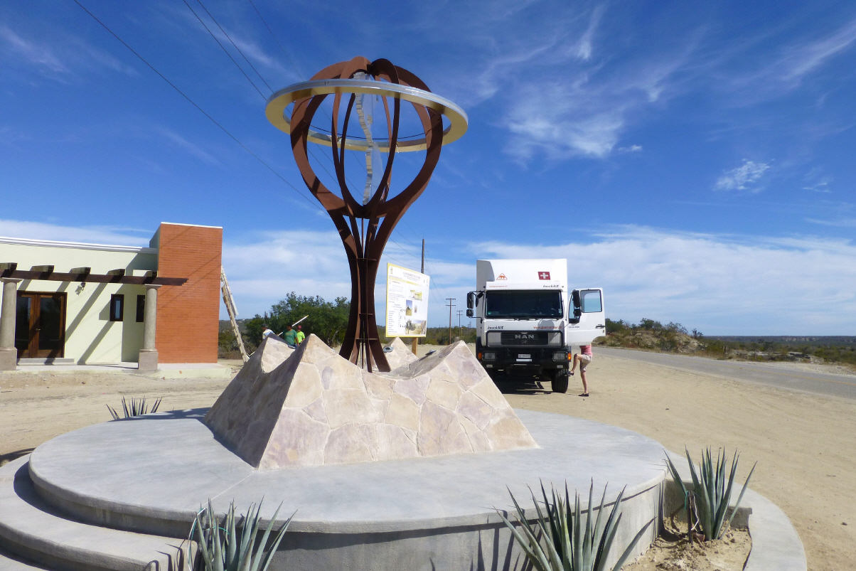 Abwaschen ist Ehrensache, auch nach dem Frühstück! Kaspar will keine Hilfe, denn er fürchtet, dass es sonst Rollenwechsel gibt und er kochen muss. Er selber hält nicht gerade viel von seinen Kochkünsten. Geschweige denn er müsste das Zeug noch essen. Verabschieden uns von der netten Grossfamilie und verlassen ‚Aguas Calientes‘. Kurz nach ‚Santiago‘ fahren wir über den nördlichen Wendekreis des ‚Tropical Cancer‘; 23°27,5min. Nun befinden wir uns also wieder in den Tropen. Den gleichen Breitengrad, aber südlich, haben wir im Norden von Chile überfahren. Hier wird gerade ein kleines Denkmal mit Souvenirläden gebaut. Natürlich steigen wir aus um zu fotografieren. Beim Aussteigen sieht Bigi, dass auf ihrer Seite Wasser aus dem Aufbau fliesst. Kaspar eilt sofort um den MAN und öffnet die Aussenklappe der Toilette. Und siehe da, er hat beim vorigen Entleeren versehentlich die Aussendusche angestellt. Dadurch ist der Innenraum mit Wasser geflutet. Was ist Kaspar doch für ein Held?! Zum Glück ist unsere Küche nicht gross, das Auftrocknen dauert nicht allzu lange und es ist schönes, heisses Wetter. In ‚San José del Cabo‘ kurz einkaufen. Dem schön braun gebratenen Pollo können wir kurzerhand nicht wiederstehen. Suchen zwischen Nobel-Hotels einen schönen Platz um Kaffee zu trinken. Eigentlich stellt sich Bigi ein schönes Kaffee am Boulevard vor. Finden aber nichts. Erst einige Kilometer ausserhalb, direkt neben dem schicken Hotel Hilton gibt’s einen relativ schönen Platz. Stehen etwas vom Meer zurück versetzt. Bigi möchte baden, aber das Meer ist ziemlich rau. Sie ist schon etwas enttäuscht. Kaspar überredet sie, den Hotel Pool aufzusuchen. Bigi zögert, aber Kaspar setzt sich für einmal durch! Wer kann bei diesen vielen Leuten feststellen, ob wir Gäste sind oder nicht. Geniessen das Bad im riesigen Pool ausgiebig. Alle Leute im Pool schwenken ihren Drink in der Hand. Leider wissen wir nicht, ob das Hotel ‚all inklusive ist‘, sonst ………! Zurück im MAN studieren wir Reise- und Campingführer. Ein uralter Amischlitten fährt vorbei. Kaspar winkt zum Gruss, der erwidert wird. Nach zwei Minuten steht das Auto neben uns. Wieder einmal tauschen wir uns mit Leuten aus. Er ist pensionierter Weinbauer in Kanada. Wir können dies fast nicht glauben, denn Kanadischen Wein haben wir noch nie getrunken. Er gibt uns einige Tipps von Alaska und zeigt uns, wo er einen ‚Claim‘ zum Golf schürfen abgesteckt hat. Nun haben wir die Adresse und werden ihn in etwa 3 Jahren dort aufsuchen. War wieder einmal eine nette Begegnung und ein Besuch könnte interessant werden. Sitzen im Pyjama beim Znacht. Kaspar sagt: ‚sölled mir eus i Schale stürze und is Hotel as Buffet gah?‘ PS für Baja Fahrer: es sit das Hotel 'Dreams', aber füs uns bleibt es eben Hilton!
