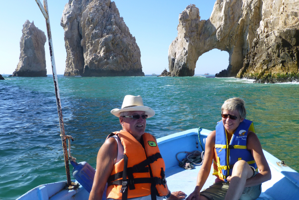 Es war laut von der Strasse her – immer diese lauten Amerikanischen LKWs. Spaziergang am Strand und weiter zum ‚Cabo San Lucas‘. Hier sind die Amerikaner und Kanadier zu Hause. 3500 Liegeplätze für ihre Yachten gibt es im Hafen. Eine Yacht ist speziell gross und im Heck steht ein moderner Helikopter. Alles ist in US-Dollar angeschrieben, Pesos ist Zweitwährung. Fahren durch die Stadt bis zum Ende. Hier suchen wir einen Parkplatz. Ein Touristen-Schlepper zeigt uns, wo wir gratis parkieren können. Natürlich fällt Bigi auf diesen Trick hinein und wir machen mit einem kleinen Boot eine Tour zum Felsenloch, dem Wahrzeichen. Einige stinkende Lobos (Roben) und Pelikane sind zu bewundern. Hier soll ein Taucherparadies sein. Dies ist der letzte Felsen, also das Finistere der ‚Baha California‘. Viele Touristenboote kurven um diese Felsen, denn im Hafen liegt ein grosses Kreuzfahrtschiff. Man sagt, dass hier in einer Höhle die Piraten ihre Vorräte und Gold versteckt hatten. Der letzte mexikanische Präsident habe jedoch alles ‚beschlagnahmt‘. Diese Höhle und der Strand wird auch ‚Playa del Amor‘ genannt – zu erkennen, wenn neun Monate später das Baby zur Welt kommt. Der Strand auf der anderen Seite ist für die Geschiedenen. Bigi nimmt ein erfrischendes Bad und dann zurück zur Hafenmole.