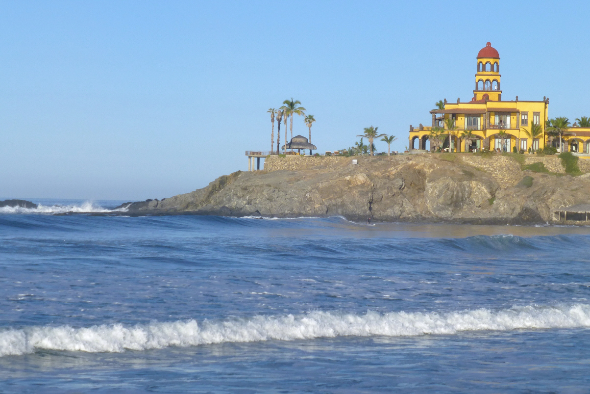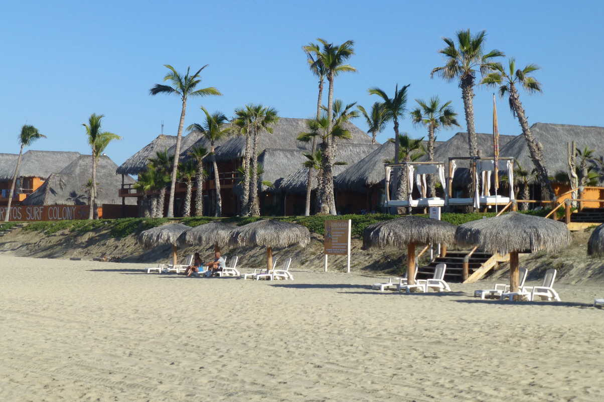 Zum Hotel gehört auch ein 5-Stern Boutique Hotel mit 10 Zimmern auf einem Felsen. Ein Zimmer kostet lediglich 600 US$ pro Nacht. Dies sehen wir uns von Nahem an. Dort oben soll man Wale beobachten können. Ausser Wellen und einer gut genährten Katze sehen wir jedoch nichts. Dem Beach entlang zurück und dann ein kühles Bad. Der Hotspot ist leider noch nicht warm um diese Tageszeit. Frühstück, baden, lesen und aufs Meer hinaus schauen. Um 14 Uhr packen wir zusammen und verabschieden uns vom Manager. Kurze 30 km bis ‚Todos Santos‘. Bei der Kirche parkieren wir. Schauen uns die kleine Stadt etwas an, holen uns Infos beim Touristenbüro. Fahren zur Schildkröten-Brutstation. Gleich daneben ist ein grosser, ebener Platz hinter der Beach. Schleppen die Stühle an den Strand.