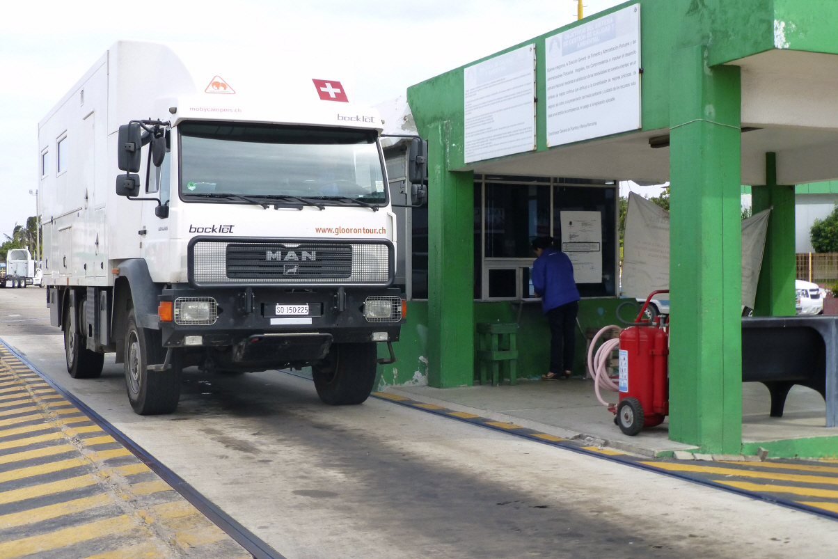 Für ‚Holz-Klasse‘ gut geschlafen! Trinken einen Kaffee Americano = Kaffeebrühe und essen dazu eine furztrockene Schnecke. Bigi ist halb tiefgefroren! Um 9 Uhr ist die Fähre im Hafen. Der ‚Driver‘, also Kaspar, darf zum Fahrzeug. Der Passagier Bigi muss in der Reihe mit allen Passagieren zum Aussteigen anstehen – ohne einen Peso oder Ausweis im Hosensack! Das Ausladen geht ruck zuck. Wegen des Öls kommt der MAN die steile Rampe hinunter etwas ins Rutschen. Aber alles geht gut. Ab auf die Waage und die Hafentaxe von 220 Pesos bezahlen. Kaspar sucht Bigi auf dem weitläufigen Hafengelände. Zum Glück ist Bigi gross und Kaspar macht mit einem scharfen Pfiff auf sich aufmerksam. Durch die Hafenausfahrt, doch oh Schreck, es gibt eine 400 m lange, zweispurige LKW/Autoschlange. Das Militär kontrolliert sehr, sehr scharf. Für uns unverständlich, dass alle drei Fähren zur gleichen Zeit im Hafen ankommen! Alles wird kontrolliert. Dieseltank öffnen und Stab hinein, um festzustellen, dass keine Drogen darin versteckt sind. Die Soldaten klettern wie Affen bei Camions über Kisten und Koffer. Auch bei uns wollen sie einiges sehen. Der Wassertank unter dem Sitz interessiert sie. Einer der Soldaten leuchtet diesen mit Taschenlampe aus. Ein Soldat kommt aus Chiapas. Er hat schon vorher gefragt, ob wir dort waren. Im MAN sieht er dann das kleine Täschchen mit der Aufschrift ‚Chiapas‘. So kommen wir bei der Kontrolle vermutlich etwas besser davon. Drogenhunde werden auf die PKWs gehetzt. Bei einem PKW wird ganz genau hingeschaut. Motorhaube, Kofferraum, Türe, alles offen und sechs Militärs um und unter dem Auto. Jetzt nur noch die Desinfektion und endlich, endlich nach 4 Stunden das Hafengelände verlassen. Wir atmen auf. In der Wartezeit haben wir geduscht, Kaspar sich rasiert und die Haar gewaschen – obwohl auf einmal Bigi ihn gedrängt hat – wäre ja was, wenn er bei der X-Ray-Kontrolle nackt in der Dusche steht!