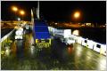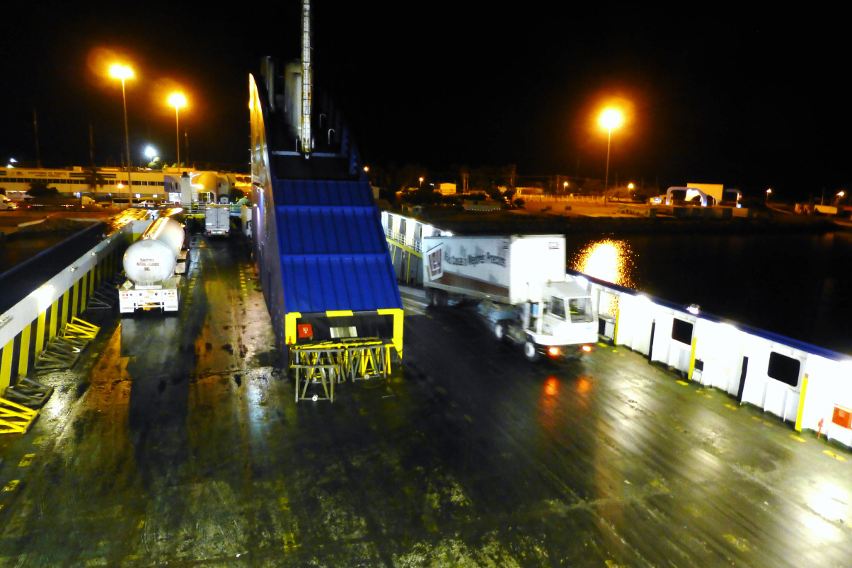 Wir sind fast die ersten, welche an Bord im ersten Stock einfahren können. Die steile Rampe hinauf, aber es geht fast nicht. Die Reifen schleifen, Wieso? Die Rampe ist voller Öl. Suchen unsere Sitze im fünften Stock im Salon. Diese passen uns jedoch nicht. In der Bar sind der ganzen Wand entlang grosse Sofas. Hier lassen wir uns in einer Ecke nieder und richten uns für die Nacht ein. Es ist hell und ein paar Fernseher laufen. Eine Stunde nach Abfahrt fängt eine Mexikanerin an laut, noch lauter zu singen. Das kann ja heiter werden. Doch nach einer Stunde ist zum Glück Schluss und wir versuchen zu schlafen.