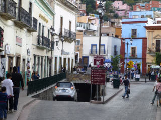 Der Fluss, welcher immer schlimme Hochwasser führte, wurde umgeleitet und auf dem ausgetrockneten Flussbett eine Strasse asphaltiert. Super Lösung für ‚Guanajuato‘ am steilen Berghang mit zum Teil sehr schmalen Gassen. Eine Gasse ist gerade mal 1 m breit und Liebende können sich hier treffen und von Balkon zu Balkon küssen.