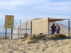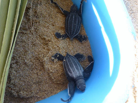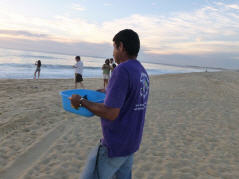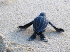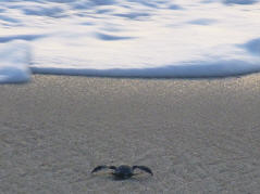 Sehen in weiter Ferne Fontänen von Walen. Um 17 Uhr kommt der Leiter der Schildkrötenstation (www.todostortugueros.org). Zwei kleine Schildkröten, eine Stunde alt, hat er in einem mit Sand gefüllten, blauen Plastikbecken. Die frisch geschlüpften Schildkröten sind etwa 7 cm gross, schwarz und wenig gestreift. Sie werden bei Sonnenuntergang am Strand ausgesetzt, denn dann sind sie nicht mehr so leichte Beute für die Vögel. Sie sollen ca. 3 m gross und bis zu 250 Kilos werden. Kaum zu glauben. Den Weg ins Meer müssen die kleinen Tierchen selber suchen. Eine anstrengende Wanderung, werden sie von den Wellen doch immer wieder zurück an Land gespült. Doch endlich haben sie es geschafft. Die zwanzig anwesenden Besucher applaudieren. Wir spenden der Schildkrötenstation 500 Pesos und sind somit Adoptiveltern der zwei Schildkröten. Hierfür dürfen wir eine Kartonschildkröte mit Namen beschriften, die dann am Zelt angebracht wird. Schweizer waren sicher noch nicht viele hier!