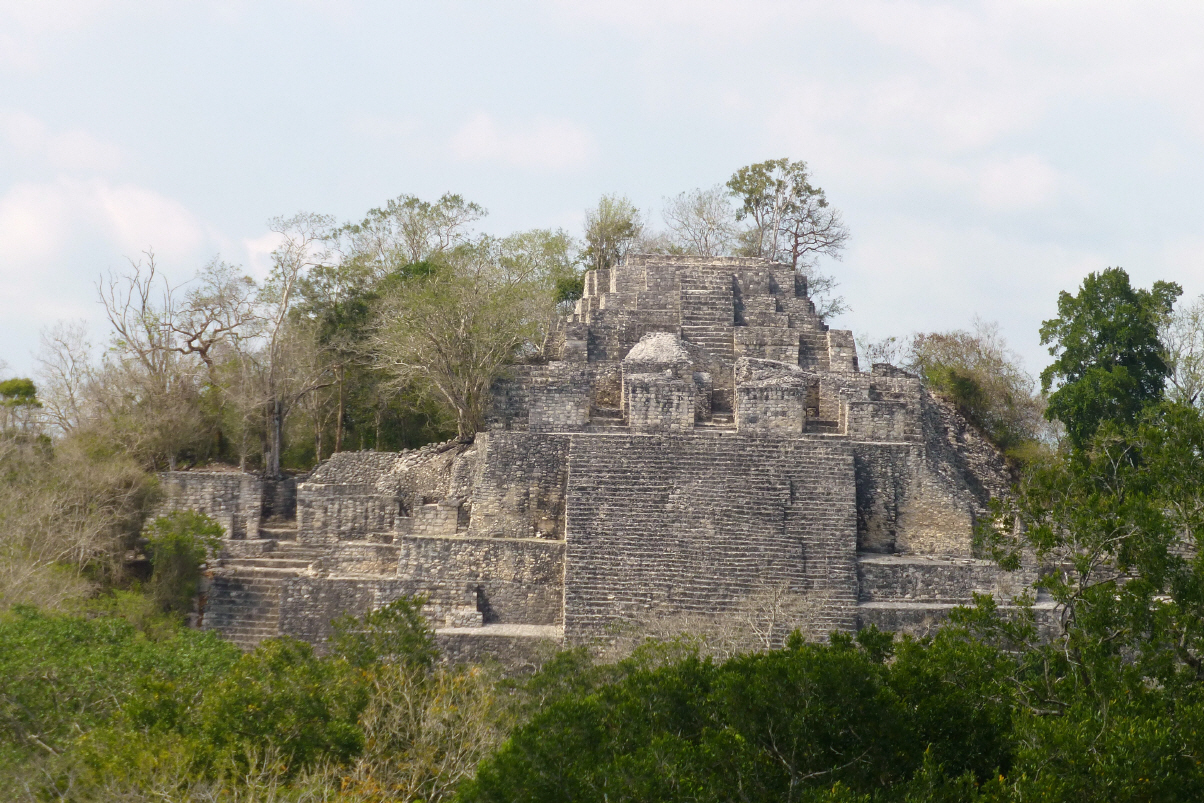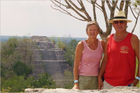 Uf, war das eine Nacht! Kaspar musste alle 30 Minuten aufs WC. Er hat sich aber recht gut erholt. Die 40 km (1 Stunde) zur effektiven Ruine müssen wir den Parkbus nehmen. Wir sind die einzigen Gäste, die sich chauffieren lassen. Der Fahrer bietet uns Begleitung gegen ein Trinkgeld an. Fragen ihn nach dem Preis. ‚Egal, was ihr wollt.‘ Bieten ihm 100 Pesos, geben aber am Schluss für die gute Führung 150 Pesos. Es sind erst einige der höchsten Tempel ausgegraben und restauriert. Alles befindet sich im tiefsten Urwald. Besteigen die zwei höchsten Tempel von 96 m und 112 m. Kaspar geht schon mal der Schnauf aus. Da hilft nur auf die Stufen sitzen und trinken, trinken, trinken!