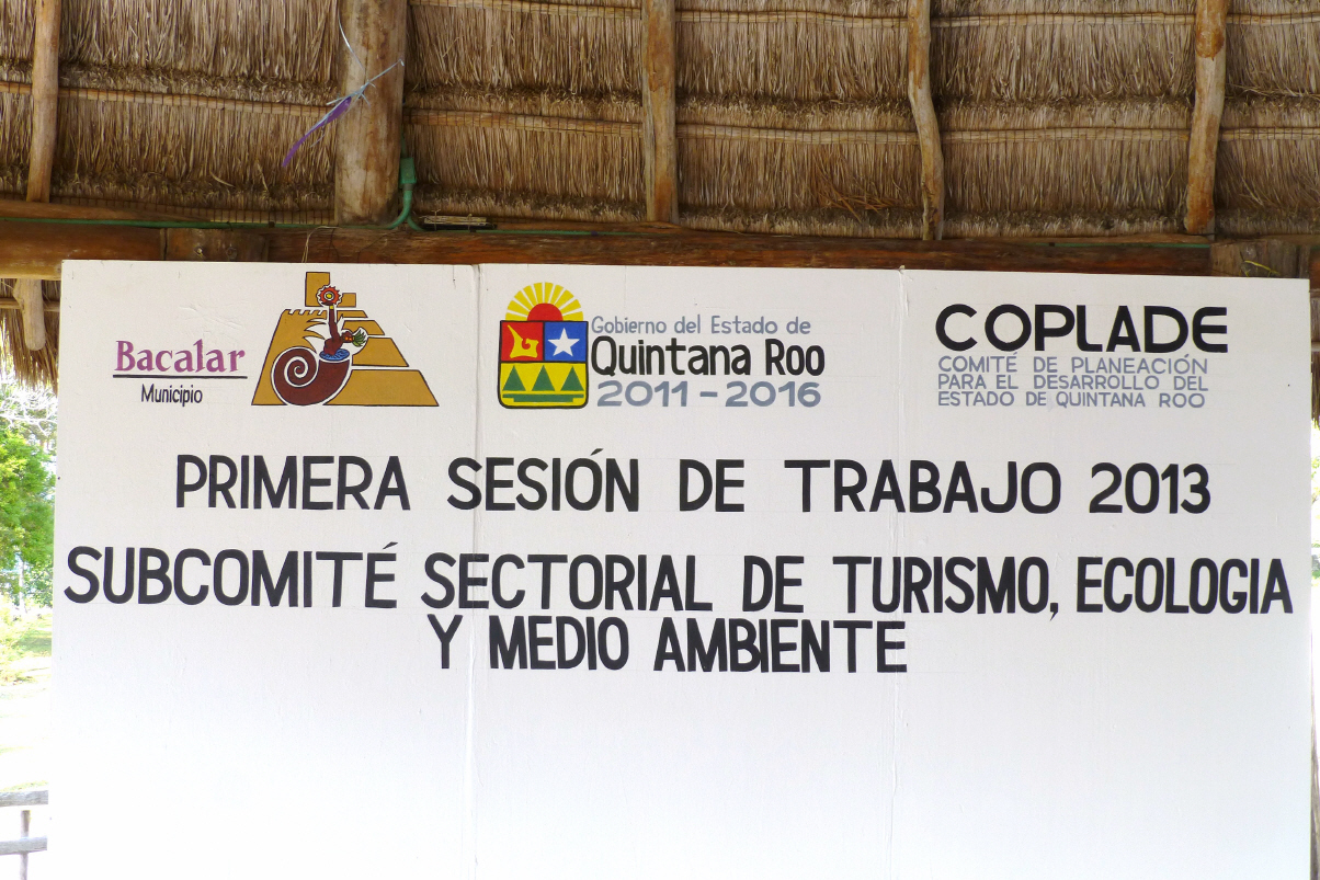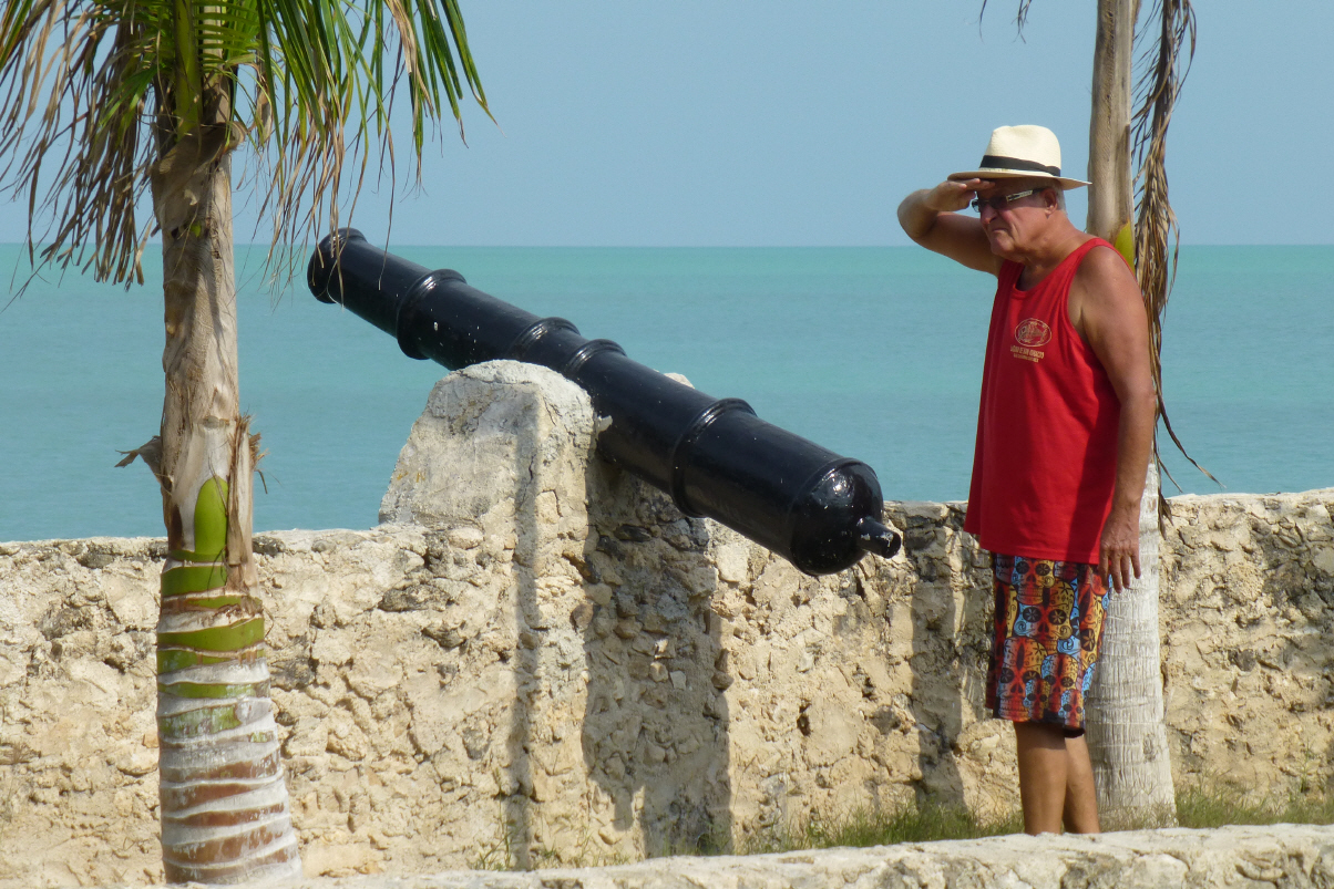 Heute fahren wir wieder einmal mit einem kleinen Fischer-Ausflugsboot. Müssen auf andere Touristen warten, um den Preis tief zu halten. In Mexiko bezahlt man immer für ein Boot, ein Zimmer usw. Viele sehr schöne Villen stehen am Wasser. In der ‚Lagune der sieben Farben‘ gibt es drei Cenoten, gut erkennbar an der dunkelblauen Wasserfarbe. Überhaupt ist das Farbenspiel des Wassers hinreissend. Von ganz hellgelb über türkis bis zu dunkelblau. Dann fahren wir zum ‚Canal des Pirates‘. Anscheinend kamen hier die Piraten mit Kanus in die Lagune. Genau gegenüber steht ein spanisches Fort. Morgen ist hier im Park eine Versammlung. Schon den ganzen Nachmittag ‚arbeiten‘ vier Mexikaner, um ein paar Wandteilstücke aufzustellen und anschliessend weiss zu malen. Der Schriftenmaler arbeitet bis spät in der Nacht – eine ‚reife‘ Arbeitsleistung!