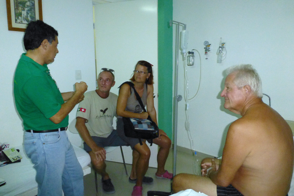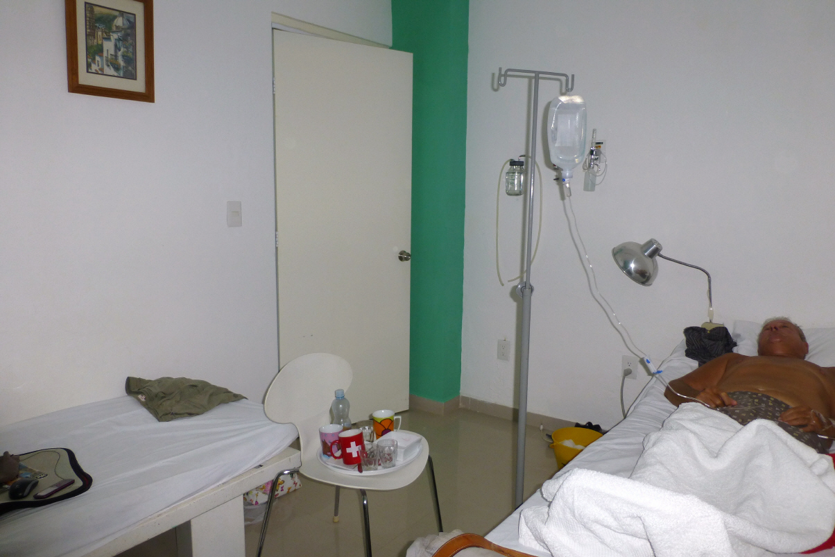 Es ist übrigens eine 24-Stunden Privatklinik. Das Zimmer hat ein Spitalbett mit zwei Leintüchern, einem Kopfkissen, Lampe und Pritsche für Begleitung mit einem Leintuch. Bad/WC mit null Komma null. Essen kann man auswärtsbestellen. Wasser gibt’s bei der Anmeldung. Ein Frottétuch für Kaspar haben sie gebracht mit einem Stück Seife. Zu Pillen gibt‘s einen Schluck Wasser. Arzt, Krankenschwester und Nachtkrankenpfleger sind sehr nett! Der Arzt spricht Englisch! Was wollen wir mehr?! Das Zimmer hat kein Fenster, dafür Klimaanlage und Fernseher. Das Fieber steigt und steigt wieder! Kaspar sollte 15 Minuten kalt duschen. Er weigert sich am Anfang standhaft. Doch es nützt alles verweigern nichts. Mit Bigi’s Zureden wird er unter die kalte Dusche - ein Rinnsal - gesetzt. Sogleich versucht er den Warmwasserhahn aufzudrehen, aber in diesen heissen Ländern gibt es fast nie Warmwasser. Nachher kriecht er unter die Decke auf das nasse Leintuch. Er bekommt kein frisches Leintuch, auch wenn der Pfleger zuschaut, wie wir ein Frottiertuch auf das Bett legen. Wegen der starken Medikamente hat Kaspar Alpträume. Am zweiten Tag dann das Resultat des Malariatests: negativ! Wir sind erleichtert! Der Arzt und wir sind uns sofort einig, noch eine zweite Nacht zu bleiben. Somit wird er überwacht und erhält immer die notwendige Infusion und Dosis Antibiotika. Der Arzt sagt zu Kaspar: ‚strong man, good patient!‘ Bigi verwöhnt Kaspar mit gutem Essen (Salami-Sandwich, geholte Pizza und gebratene Spaghetti). Sie ist sehr besorgt um ihn, er arrangiert sich. Kaspar macht Bigi ein Kompliment: ‚bisch e gueti Krankeschwöster, nur es bitzeli nervös‘. Wir warten auf den Arzt für den Austrittsuntersuch sowie Arztbericht und Rechnung.