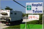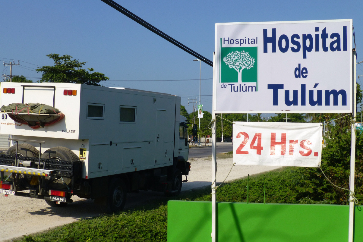 Kaspar hat es erwischt. Er liegt schwitzend im MAN, transpiri-transpira. Nach einer feucht-warmen Nacht geht es Kaspar wieder gut. Er fährt wie ‚leicht besoffen‘ nach ‚Tulum‘. Hier kaufen wir im klimatisierten Supermarkt ein. Schon nach einer Minute hat er starken Schüttelfrost. Draussen in der Hitze wird es ihm dann schlecht. Bigi hat ein Schild ‚Hospital Tulum‘ gesehen.