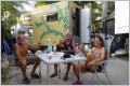 Die französische Familie neben uns bereitet sich für die Weiterreise vor. Sie arbeitet und er schaut zu. Ein kleines Aufbäumen von ihr: ‚tu ne fais rien!‘ Darauf erhebt er sich und zusammen mit dem 8jährigen Sohn verpackt er 1 (!) Campingstuhl in die dazugehörende Tasche. Die andern zwei muss sie wieder selbst einpacken. Sie muss auch immer wieder auf dem Dach herum klettern und er schaut zu. Unsere Nachbarn auf der anderen Seite sind auch Franzosen, die in einem alten, amerikanischen Schulbus hausen. Bis spät in der Nacht wird geschwatzt und Musik gehört. Aber sie sind dann dafür bis mittags im Bett. Es ist ein richtiges Hippiepaar mit einem Jungen (make love not ware). Das Werbeplakat am Bus zeigt was sie arbeiten: Nomadenkunst - Federschmuck, aufgemalte Tatoos und Hippiekleider. Kaspar wird von den Ameisen angebrünzelt. Nun hat er einen neuen Sport: Ameisen killen. Baden im 40 C heissen Pool und trinken Eistee.