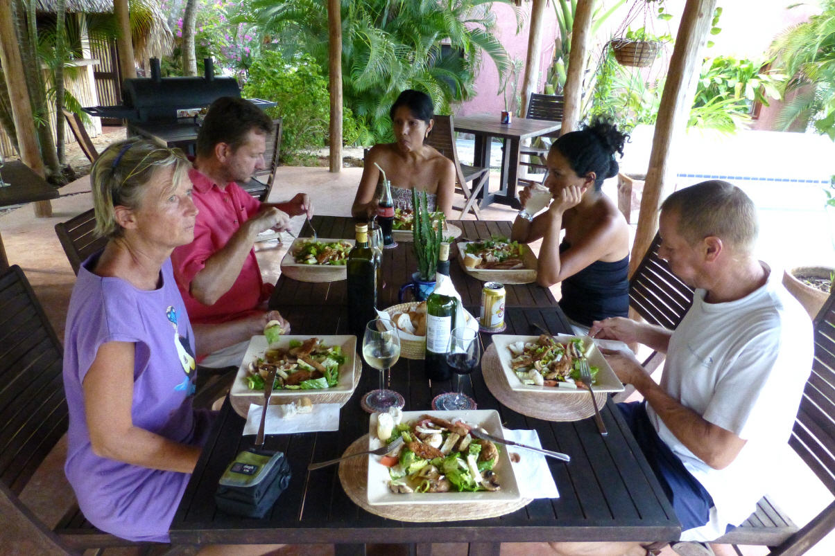 Die ganze Tour dauert 5 Stunden! Zurück zur Hauptstrasse und dann Richtung ‚Chetumal‘ an die Karibikküste. Hier auf dem schönen Camping waren wir vor einem Jahr schon. Wollen uns von den Strapazen erholen. Haben Hunger wie die Bären! So braten wir die Resten der Lasagne in der Pfanne. Der Schweiss läuft. Kaspar muss beim Tagebuch schreiben immer den Unterarm abtrocknen.