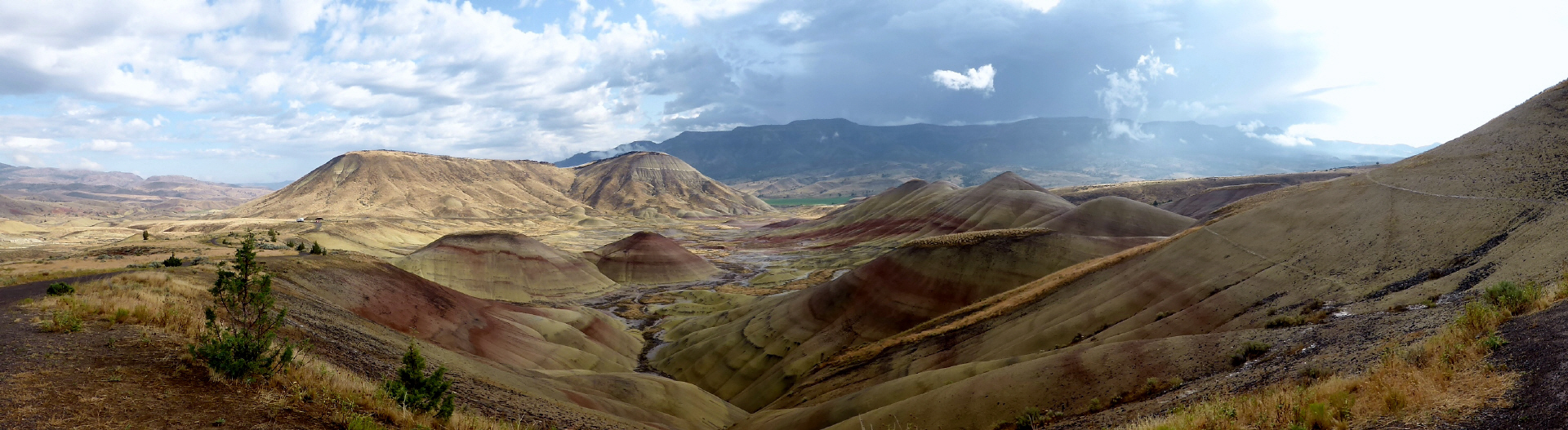 Bei der US-Post schläft man gut! Fast sind wir an den ‚Painted Hills‘ vorbeigefahren, die Bigi soeben in einer Brochure entdeckt hat. 5 Meilen zurück und dann 6 Meilen in eine Stichstrasse. Hier finden wir die wunderschönen, farbigen Berge. Das Licht ist laut einer Berufsfotografin gut, wolkig und regnerisch. Die Hügel sind gelb, rot und schwarz.