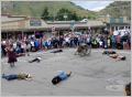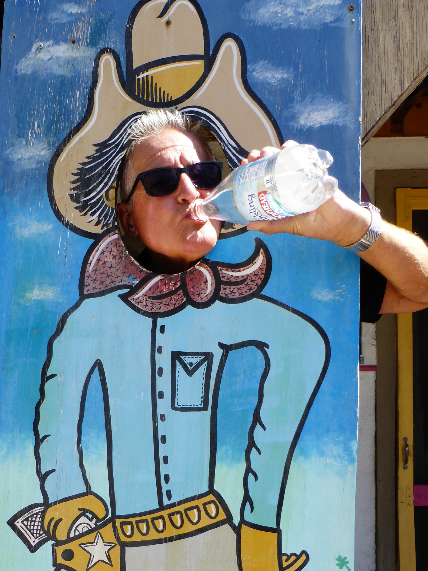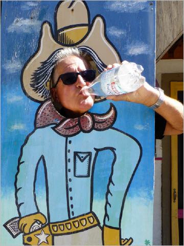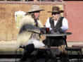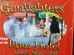Vor dem altehrwürdigen Hotel Irma in ‚Cody‘ ist eine grosse Schiesserei angesagt. Die Kulisse mit Bank, Bar, Gefängnis und Postkutsche ist aufgestellt. Der Ansager macht zuerst viel Reklame für Coca Cola, Irma Hotel, Gewehre und diverse Restaurants - alles Sponsoren. Nun kommen die Schauspieler mit zwei Fahnenträgern aus USA und Wyoming. Alle stehen auf, legen die Hüte ab und singen die Nationalhymne - mit Hand auf dem Herz. So, nun kann es losgehen. Die Geschichte ist rasch erzählt: Drei Gangster kommen in die Stadt, werden aber vom Sheriff verjagt. Sie kommen nachts zurück und überfallen die Bank, die nur noch eine Wäscherei ist. So überfallen sie die Gäste an der Bar und die Postkutsche. Riesen Knall von Dynamit. Dies ruft natürlich ‚Buffalo Bill‘ und ‚White Erb‘ auf den Platz. Kurze Schiesserei und die Guten gewinnen, die drei Gangster sind tot. Das war’s dann! Am Abend besuchen wir eine Country-Music Show. Gute Songs, die wir noch zum Teil aus der Hitparade kennen. Essen einen grossen Becher Popcorn, wie Amis!
