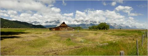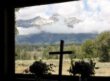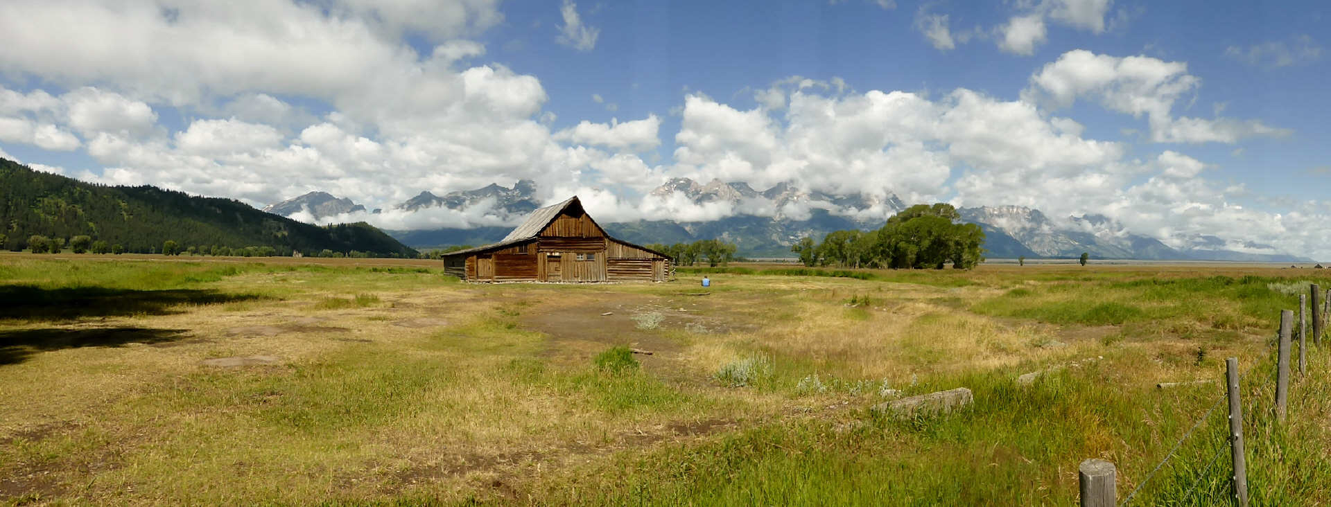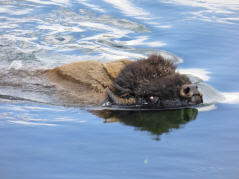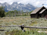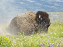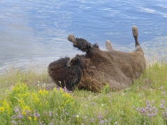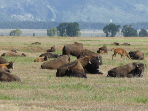 Etwas abgelegen im Park finden wir die Bisonherde. Die Bisons sind recht gross und Angst einflössend. Sie liegen im Gras und kauen wieder. Kaspar wendet den MAN auf dem Feldweg, da fühlt sich ein Bison gestört, erhebt sich und trottet davon. Auch wir fangen das Postkartensujet der Scheune mit Mount Teton (4100 m) im Hintergrund ein. Im Park steht eine kleine Kapelle.