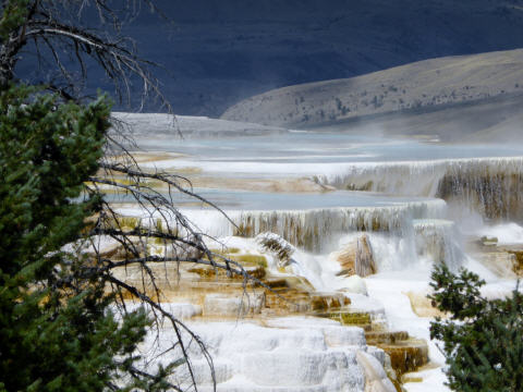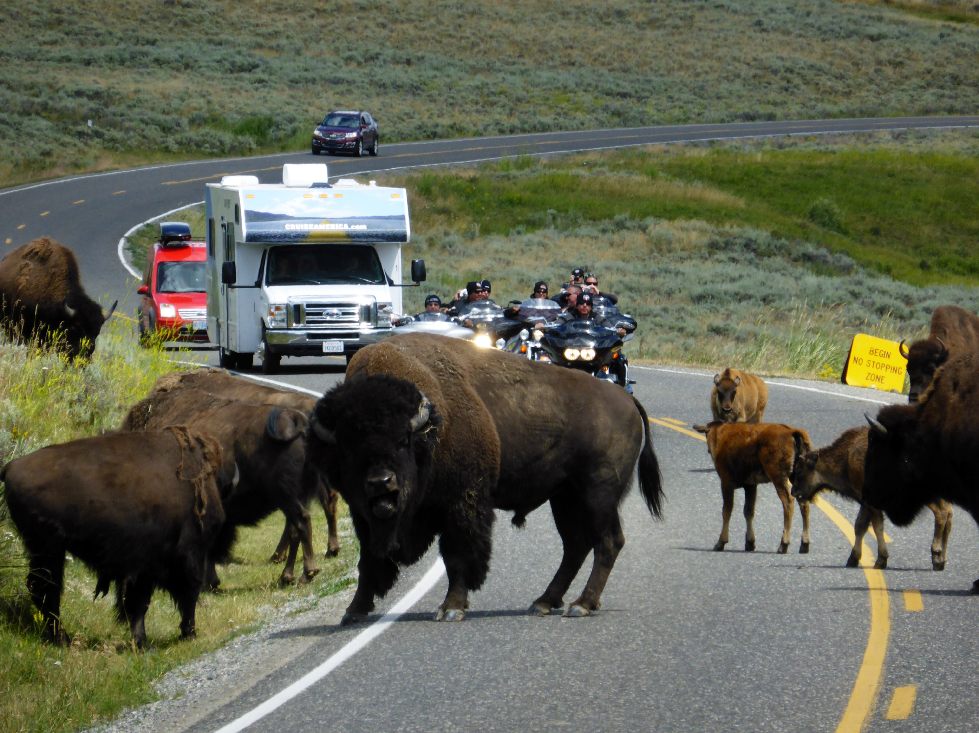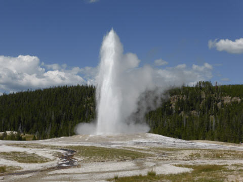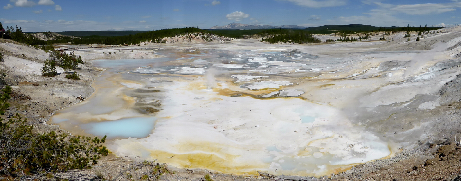 Der ‚Yellowstone‘ ist der grösste und im Jahre 1872 gegründete National Park der USA. Der ‚Old Faithful‘ Geysir speit pünktlich alle 90 Minuten eine 94 m hohe Fontaine in die Luft und zieht jeweils hunderte von Touristen an. Überall sprudeln heisse Quellen, es qualmt, dampft, riecht leicht nach Schwefel und die Erdkruste sowie Wasserpools leuchten in allen Farben. Die Holzwege dürfen nicht verlassen werden wegen Einbruchgefahr. Leider kann man nirgendwo baden, da es zu heiss (96 °C) und gefährlich ist.