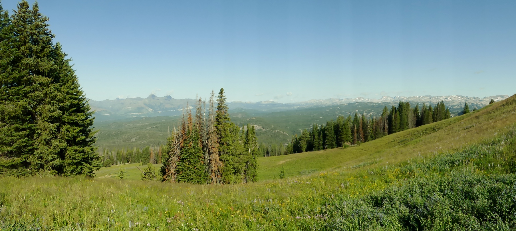 Auf der Fahrt vom ‚Yellowstone Park‘ nach ‚Cody‘ überqueren wir ein paar hohe Pässe. Hier war 1880 das Rückzugsgebiet der Indianer nach verlorenen Schlachten. Die Passhöhe macht den Schnitt zwischen fruchtbaren Ebenen mit Wäldern, Wasser, schönen Farmen und Landwirtschaft und auf der anderen Seit beginnt die Wüste und Trockenheit.