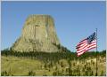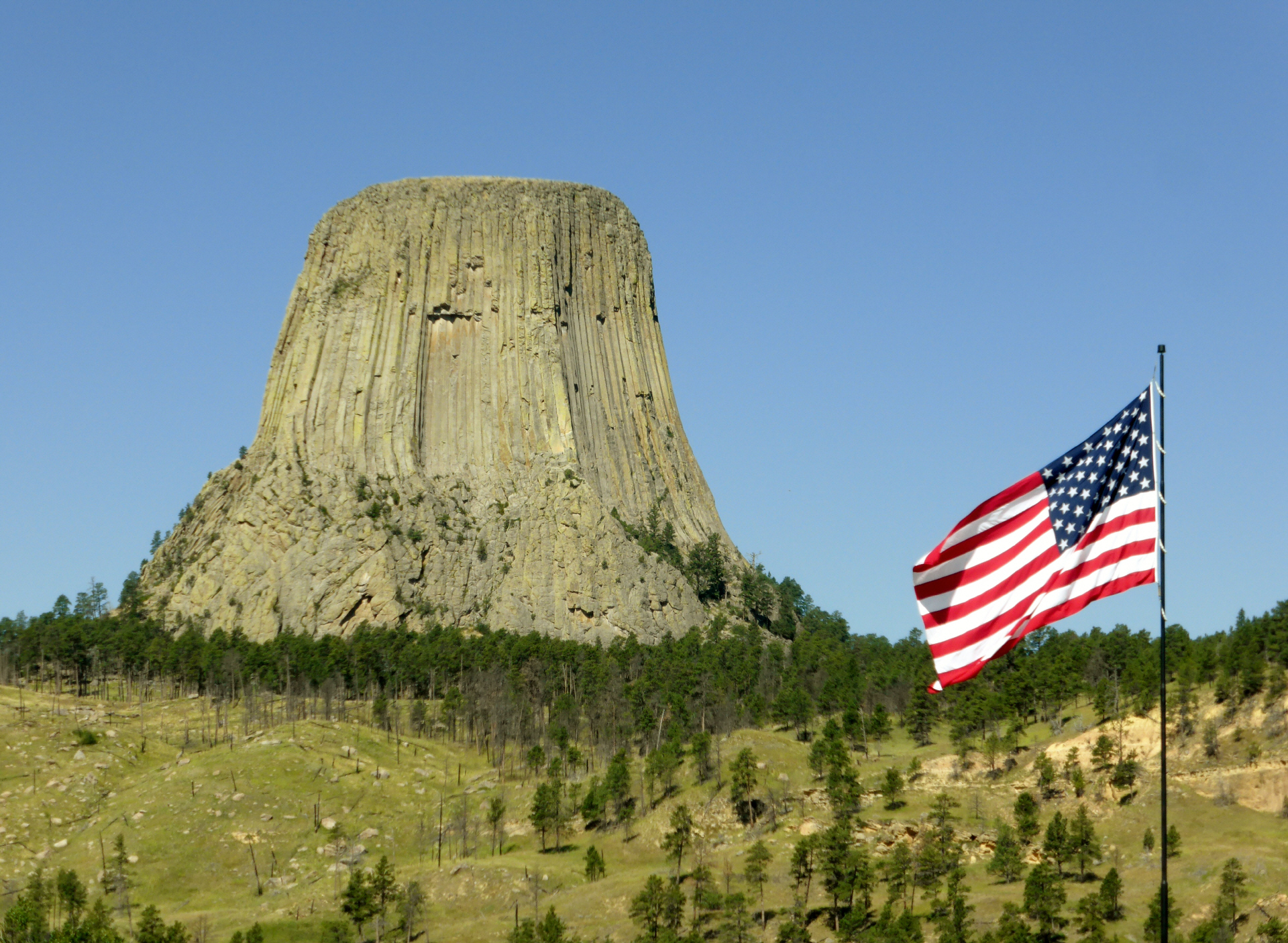 Das ‚Devils Tower National Monument‘ sehen wir schon von weitem! Der Fels besteht als sechseckigen Basaltsteinen und ragt 284 m über das flache Land hinaus. Sehen zwei Zweierseilschaften in der Steilwand.