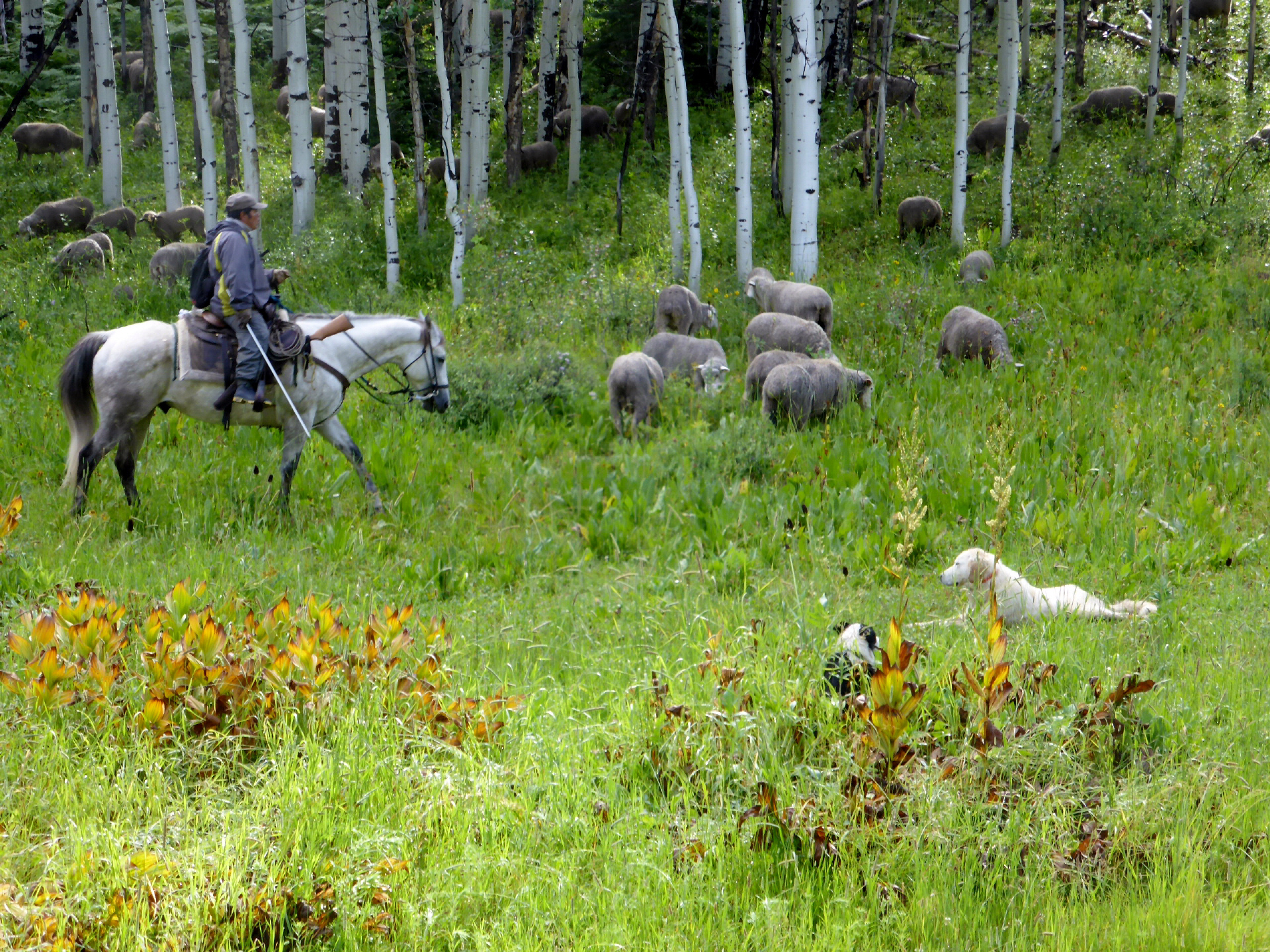 Über den ‚McClure Pass‘ und dann eine Gravelroad durch schöne Espenwälder zum ‚Kebler Pass‘ auf 3000 m. Begegnen hier oben zwei Hirten mit ihrer Schafherde und vielen Hunden. Beide haben ein Gewehr bei sich.