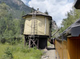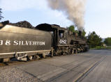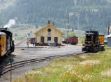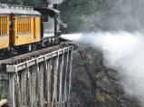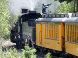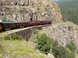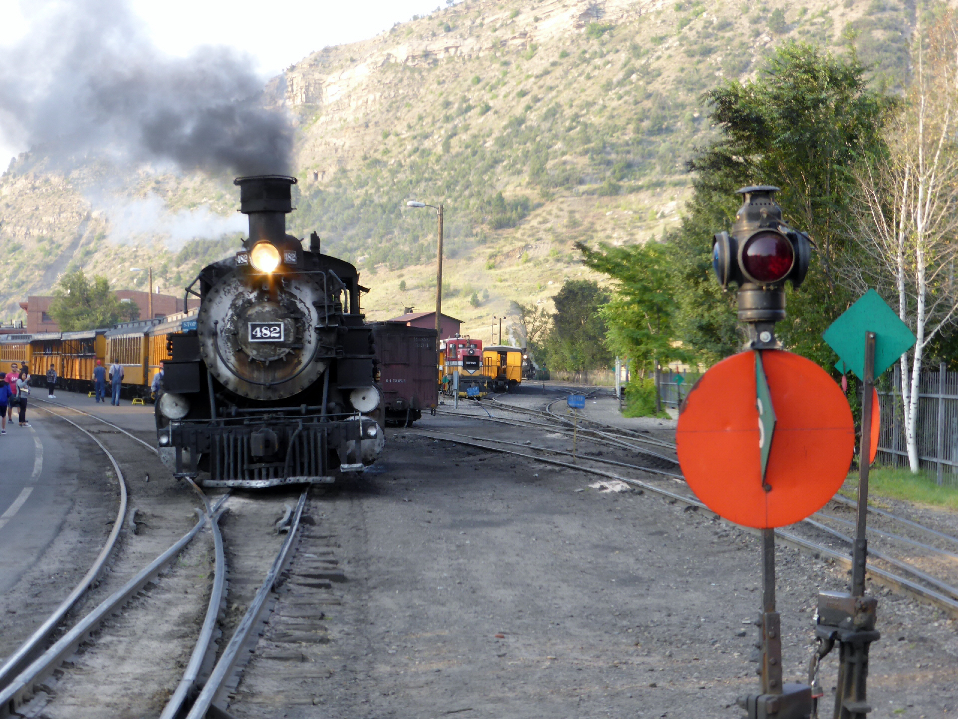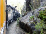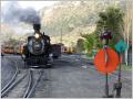 Die Dampflok ‚482‘ wird an den Zug angekoppelt. Es dampft gewaltig. Belegen unsere Plätze im vordersten Wagen. Pünktlich um 8 Uhr geht es ruckend los. 46,6 Meilen sind mit einer Höchstgeschwindigkeit von 15 Meilen/Std. zurückzulegen. Die Fahrt dauert daher dreieinhalb Stunden, durchschnittl. Steigung 3 %. Die Dampflok hat 1200 PS und benötigt für die Hin- und Rückfahrt 4,5 Tonnen Kohle. Dies schaufelt ein dünner Kerl. Zwei Stopps zum Auffüllen der Wassertanks - jedes Mal 3500 Liter Wasser. Zuerst geht es längere Zeit geradeaus den Berg hinauf. Dann wird es spannend. Das Trasse musste in den Berg gehauen werden und führt der tiefen Schlucht des ‚Animas River‘ entlang. Hier darf der Zug lediglich 5 Meilen schnell fahren, schwindelerregend! In der Kurve, wenn man den Zug und die Lok sieht, wird emsig fotografiert. Zum Glück haben wir unseren Rucksack mit vielen guten Sachen (Salami, Käse, Trauben, Guetzli, Wasser und Brot, das wir vorher beim französischen Bäcker gekauft haben) bepackt – verhungern ausgeschlossen. Der Zug rüttelt, schüttelt, quietscht, kreischt, schlägt und holpert über die Schienen - dass hier überhaupt Züge fahren können grenzt an ein Wunder!