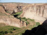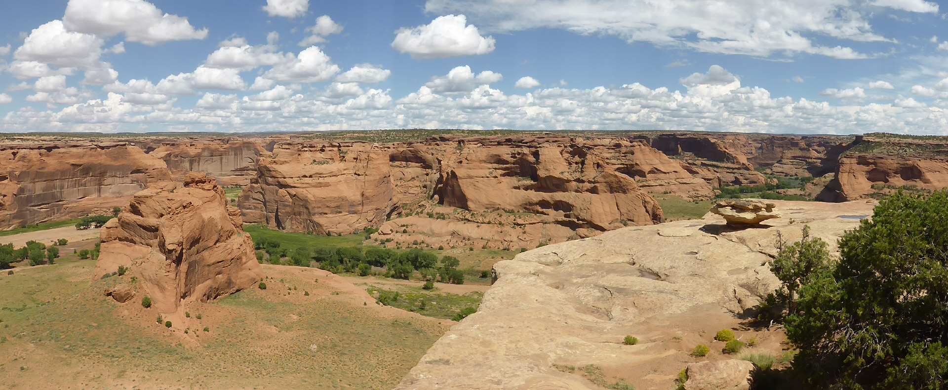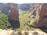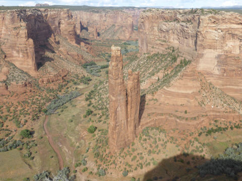 Beim ‚White House Overlook‘ packt uns die Wanderlust. Kaspar sagt: ‚Hug, ich folge meiner Frau!‘ Schöner Abstieg über einen schmalen Weg. Unten im matschigen Bachbett haut es Kaspar auf die Schnurre. Nichts passiert ausser einem dreckigen Knie. Der ‚Spider Rock‘ ist das Wahrzeichen des Parks. Vom Overlook aus sieht man die zwei hohen Felskolumnen mitten im Canyon stehen. Der Canyonboden ist grün und man sieht vereinzelt Maisfelder, genannt Noqkwiri. Dies ist eine Spezialität der Indianer, welcher uns aber gar nicht schmeckt. Für die Touristen ist eine typische, mehreckige Indianerhütte aufgebaut. Am Abend klopft ein Indianer bei uns an die Tür. Er verkauft kleine Steinplatten mit eingeritzten Indianerzeichnungen, u.a. Indianer-Casanova (Indianer mit Flöte).