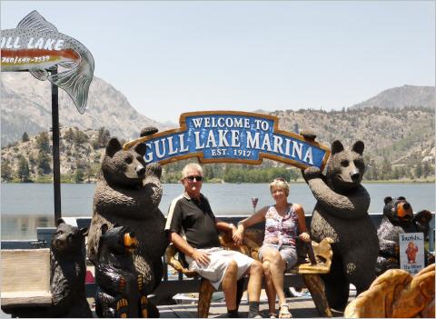 Geniessen hier die Aussicht und das verspätete Frühstück. In der Zwischenstation öffnet die Gondel und wir werden von einem Mitarbeiter gefragt ‚how are you today‘ - so eine Freundlichkeit haben wir in der Schweiz noch nie erlebt! Wir staunen: er säubert zudem jede Gondel. Viele Sessellifte fahren hier hoch - muss im Winter grandios sein. Eine Tageskarte kostet 107 $, kann aber im Voraus im Internet günstiger gekauft werden. An guten Tagen tummeln sich hier 25‘000 Gäste. Viele Sportler kommen aus dem nahen Los Angeles - nur 225 Meilen. Im Ort hat es viele Hotels, Restaurants und man hat mehr Chancen, einen Bären zu sehen als in den umliegenden Wäldern. 26 Bären bevölkern den Ort, vor allem in der Nacht.