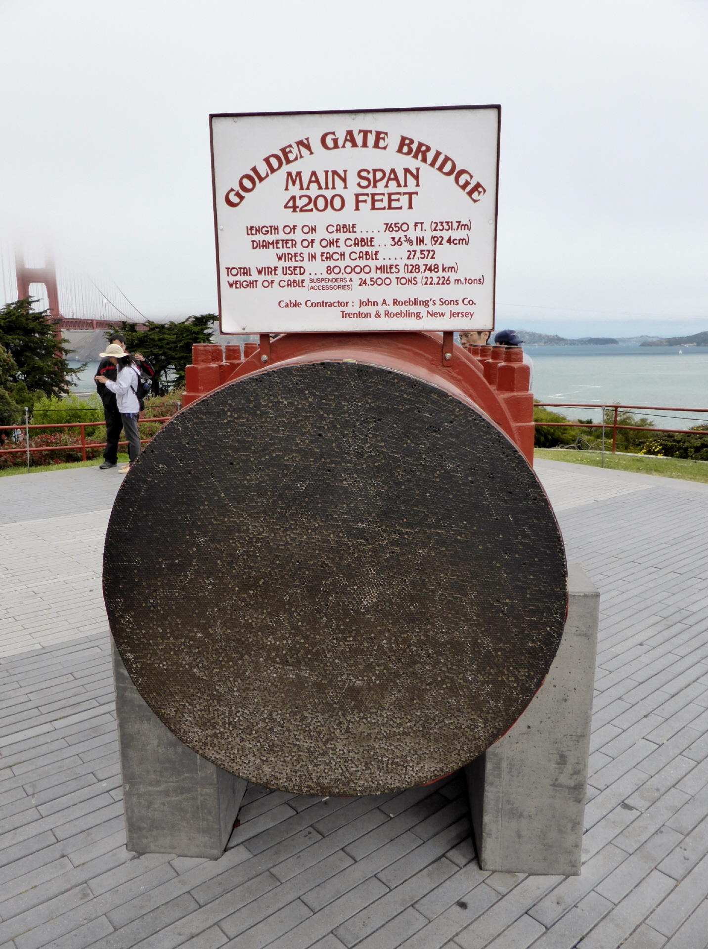 Technische Daten ‚Golden Gate Bridge‘: Gesamtlänge inkl. Auffahrtsrampen 2,789 km / Länge des Hängeseils der Brücke 1,966 km / Länge der Hauptspannweite 1,28 km / Breite der Brücke 27,4 m / Höhe der Pfeiler 227 m / Maximale Tiefe des Fundaments 33,5 m / Entfernung vom Meeresspiegel 67 m / max. Querschwingung 8,4 m / max. Schwingung nach unten 3,3 m / max. Schwingung nach oben 1,8 m / Kabeldurchmesser 0,92 m / Kabellänge 2,332 km / Anzahl von Metalldrähten in jedem Kabel 27,572 / Kabelgewicht 21‘770 t