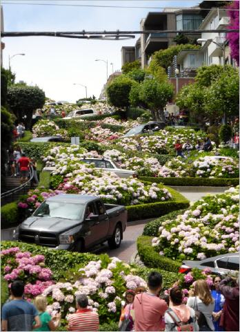 Die steilste Strasse von San Francisco wurde nachträglich mit vielen Kurven ausgebaut und seitlich schön bepflanzt. Alle wollen hier mit ihrem Auto hinunter fahren – wir verzichten freiwillig! Wir würden ohne Zweifel heute noch dort stecken oder die Polizei hätte uns mit einem Kran und einer saftigen Busse befreit!