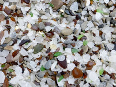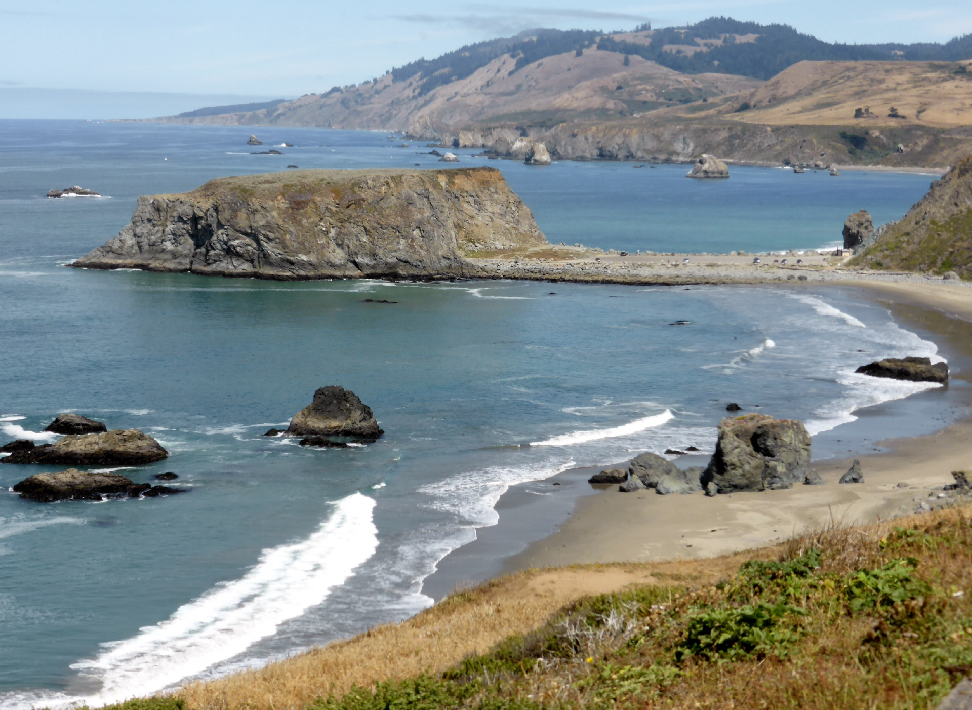 Die kalifornische Pazifikküste nach Norden ist felsig. Die Strasse auf den Klippen ist äusserst kurvig und es braucht ‚Seetauglichkeit‘. In ‚Fort Brogg‘ warfen die Amerikaner von 1949-67 allen Kehricht ins Meer. Die Strömung schwemmte das Meiste ins Meer hinaus, nur die Glasflaschen bliben zertrümmert in Küstennähe. So kann man heute an einem Strandabschnitt verbotenerweise Glaskieselsteine sammeln.