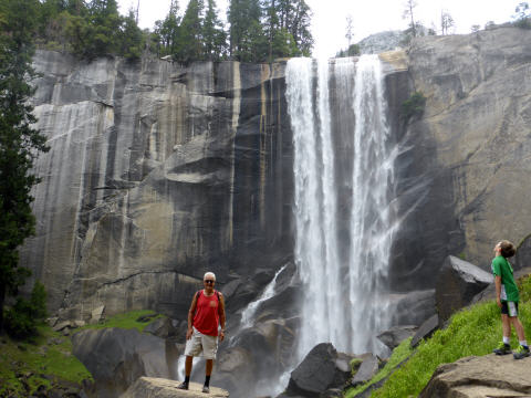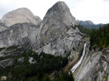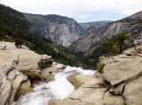 Beim ‚Tunnel View‘ schauen wir ins ‚Yosemite Valley‘ hinunter mit den beiden Wahrzeichen ‚El Capitain‘ (Steilwand) und dem ‚Half Dome‘ im Hintergrund. Im Tal läuft eine Kojote auf der Strasse und lässt sich weder von Autos noch fotografierenden Touristen stören. Wollen zum ‚Vernal Fall‘ (unterer Wasserfall). Der ‚Mist Trail‘ führt über 600 Stufen bis zur Wasserfallabrisskante. Es ist erst 11 Uhr und so steigen wir weiter auf bis oberhalb des ‚Nevada Fall‘. Den Abstieg nehmen wir über den nicht ganz so steilen Horse Trail.