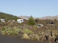 Stehen auf dem Camping inmitten eines erkalteten Lavastroms. Na ja, so interessant ist dieser Vulkanausbruch vor 2000 Jahren nicht. Man denkt immer, es ist nur schwarze Lava, aber überall spriessen Blumen, kleine Sträucher und ein paar Tannen. Sogar Squirles finden hier Nahrung.