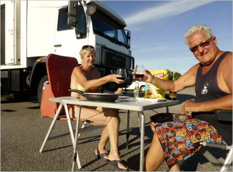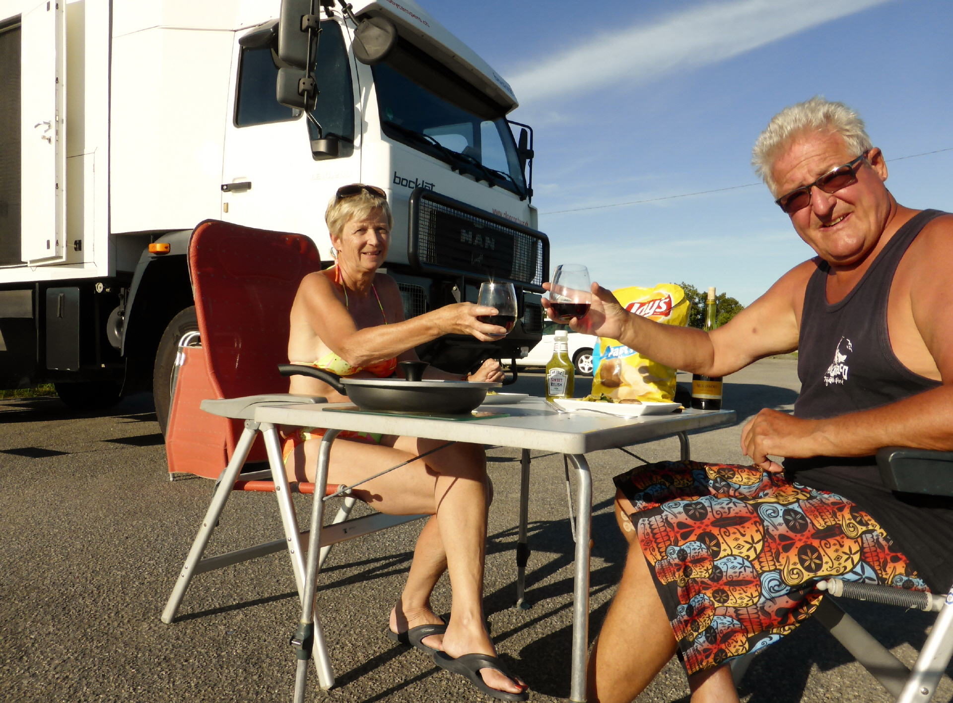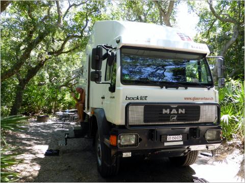 Von Zeit zu Zeit gibt es Überraschungen mit unserem MAN. Kaspar ist mit Rasierschaum eingeschmiert und bemerkt, dass kein Wasser aus dem Hahn kommt. Wasserpumpe defekt, also Ersatzpumpe in den Ersatzteilkisten suchen und ersetzen. Es muss wieder einmal etwas denken, denn sonst ist alles unter Wasser. Beim Fahren haben wir ein Vibrieren. Nach einiger Zeit findet Kaspar heraus, dass der Auspuff scheppert. Auspuffbride anziehen und mit Gegenmutter sichern.