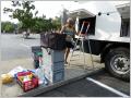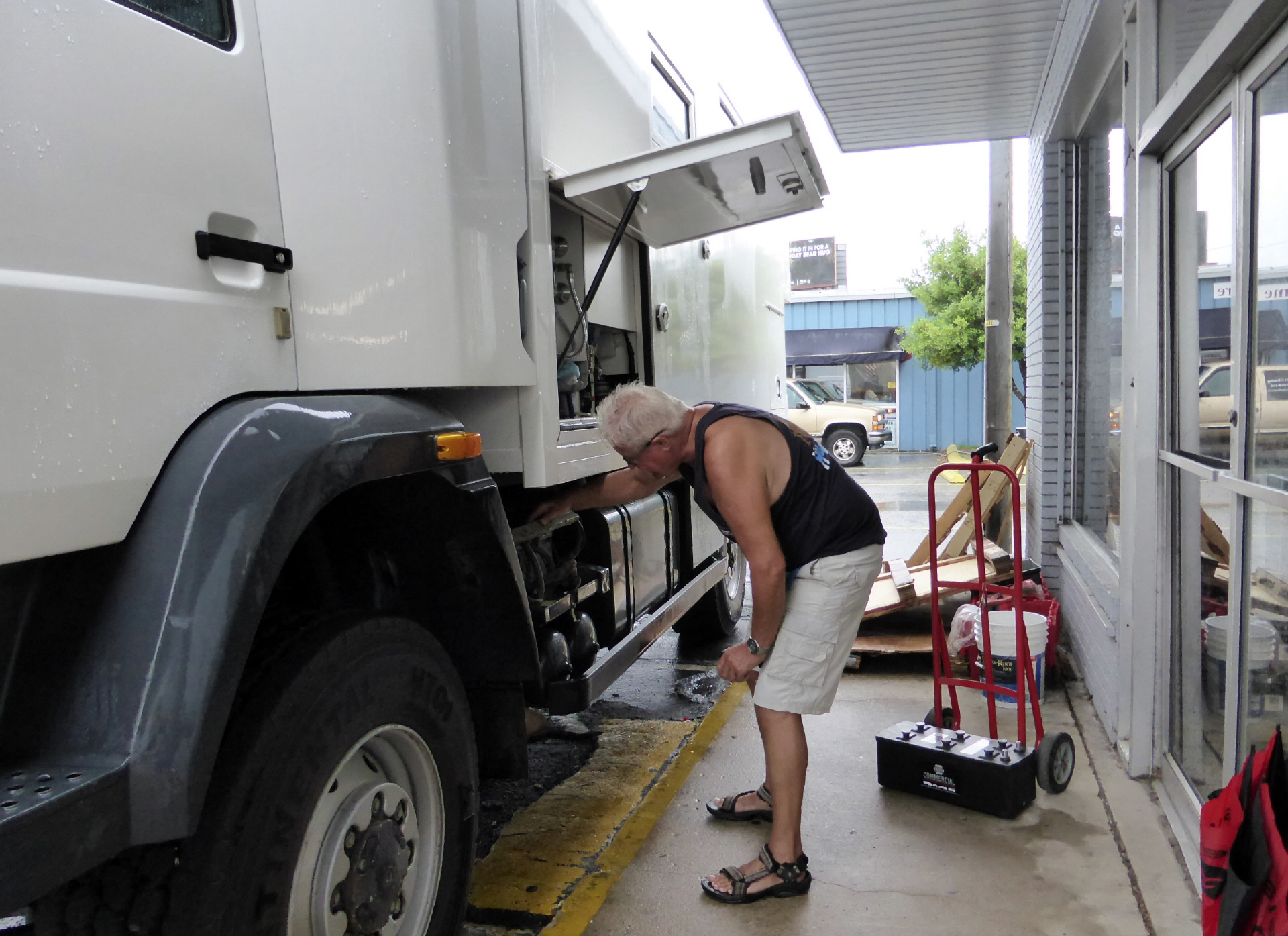 Wir wissen seit längerer Zeit, dass unsere Starterbatterien nicht mehr die Besten sind. Der Motor springt nur noch mit ‚Ach und Krach‘ an. Fahren zu ‚Napa‘-Autoersatzteile. Dort lassen wir den Motor vorsichtshalber laufen. Der Ersatzteilverkäufer sagt uns, dass er ähnliche Batterien hat. Also MAN quer zum Geschäft nahe ans Vordach parkieren, damit wir nicht all zu nass werden. Bigi deckt mit dem grossen Schirm ab. Inzwischen hat es richtig zu stürmen und schütten angefangen – Ankunft von ‚Arthur‘! Aber doch noch Glück gehabt, denn morgen ist Nationalfeiertag und das Geschäft bleibt geschlossen!