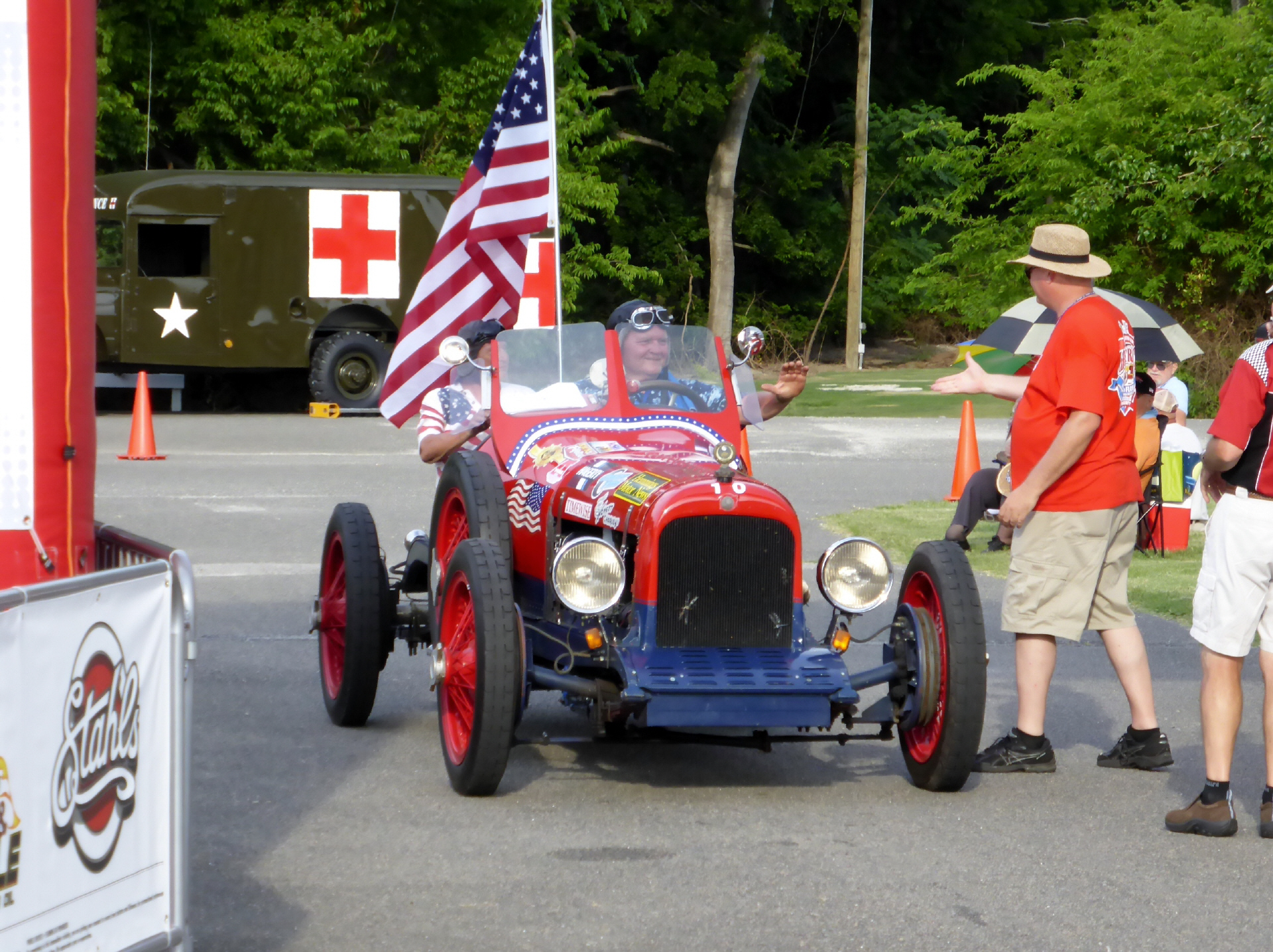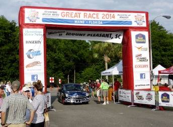 Wieder einmal Glück gehabt! Es ist die Ankunft des Rallys ‚Great Race 2014‘ von Maine nach Florida angesagt. Wir verfolgen die Ankunft der Oldtimer. Der älteste Sportwagen ist aus dem Jahre 1919! Die Fahrzeuge sind wunderschön restauriert, das Interieur und auch die Aussenfarbe sind meist nicht originalgetreu - an Fotosujets fehlt es nicht! Dort wo unser MAN steht gehen wir ins Restaurant ein Cola trinken und kühlen uns dank Klimaanlage ab. Hier werden etwas später die Rally-Teilnehmer zum Umtrunk erwartet. Mal schauen, wie laut es wird. Auf jeden Fall zieht der Wind wunderschön durch unseren Wohnraum. Schwarze Wolken ziehen heran und schon bald beginnt es zu regnen, regnen und regnen. Wir sehen noch ein paar Rally-Fahrer in ihren alten, offenen Autos vorbeifahren. Mit dem Umtrunk wird nichts mehr, denn man schickt keinen Hund nach draussen.