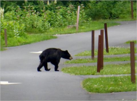 Fahren den ‚Skyline Drive‘, die kurvige Panoramastrasse auf 800 m.ü.M. mit Geschwindigkeitsbegrenzung von 35 Meilen/Stunde (57 km/h). In einer Kurve sieht Kaspar plötzlich ein schwarzes Bein. Er fragt: ‚git’s da Bäre?‘ Ja, im Park gibt’s 300 – 600 Bären. Wir müssen uns jedoch gedulden, sehen wir doch erst nach 6 Tagen einen über den Camping spazieren. Bären sind im Allgemeinen ungefährlich. Verhaltensregel: still stehen und Hände hoch. Somit hat er ein grosses Gegenüber. Versuchen mit ihm zu schwatzen: ‚hello, how are you my friend‘. Ob er antwortet? Meist trottet der Bär dann ruhig davon.