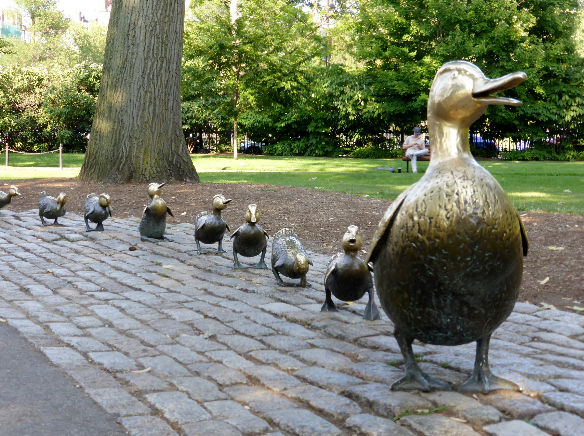 Auf vielen Postkarten ist eine Gruppe Bronze-Enten abgebildet. Wir haben lange gesucht, bis wir im Park fündig wurden.
