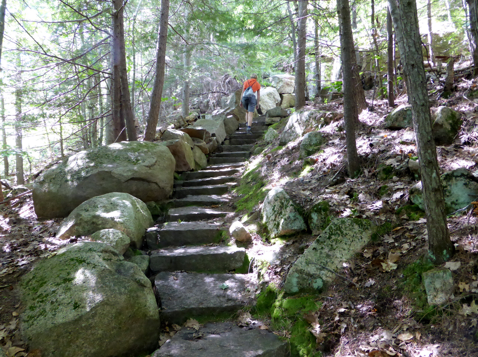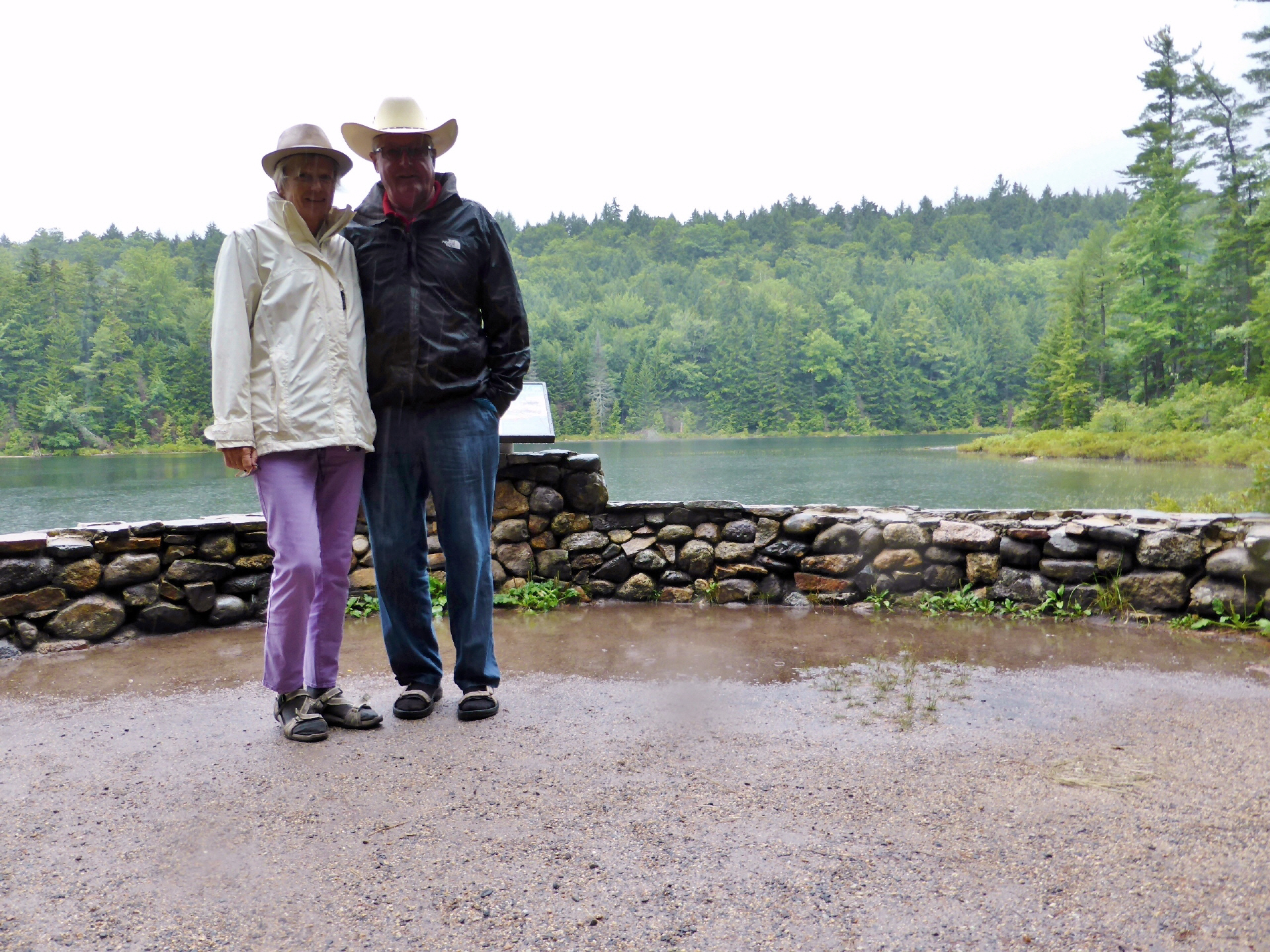 Wandern auf den ‚Mount Dorr‘ (387 m.ü.M.). Das spektakuläre an diesem Weg sind die Steintreppen. Schön angelegt, aber am Ende recht anstrengend. Uns fehlt das Trainig! Das ‚Thunder Hole‘ (Donnerloch) ist bei den Touristen beliebt. Es ist eine kleine, unterirdische Höhle. Kommt die Flutwelle, wird die Höhle verschlossen und die Luft darin komprimiert. Geht die Welle zurück, so explodiert das Ganze, es gibt ein Donnergrollen und die Gischt spritzt aus dem Loch. Sitzen an der Sonne und warten zwei Stunden auf die Flut, die zu wünschen übrig lässt. Dafür beginnt es stark zu regnen und wir werden bis auf die Haut nass.