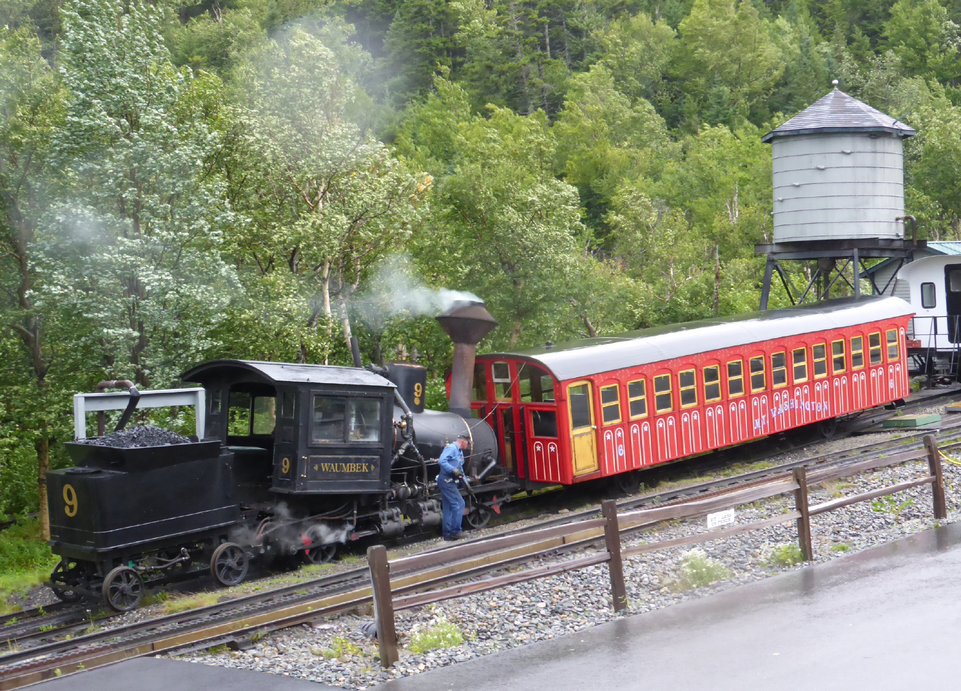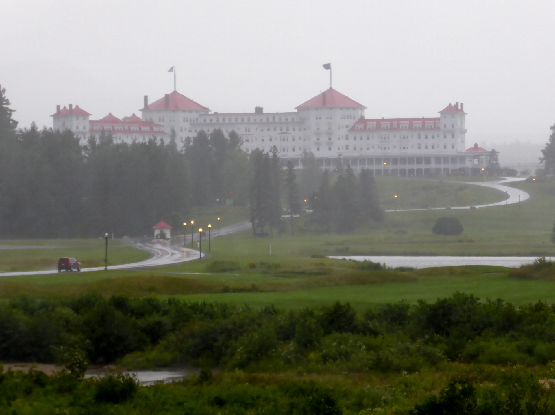 Fahren zum Mount Washington. Es regnet in Strömen. Die steile Zahnradbahn aus dem Jahre 1869 fährt heute nur bis zur Hälfte hinauf wegen starkem Wind. Auf dem Gipfel (2100 m) können extreme Wetterverhältnisse auftreten. So wurde 1934 auf dem Berg eine Windgeschwindigkeit von 327 km/Stunde gemessen! Zurück nach ‚Bretton Woods‘ zum riesigen, alten, luxuriösen Hotelkomplex. Im ‚Mount Washington Hotel‘ wurde Weltgeschichte geschrieben. Im Juli 1944 wurde die Weltwährungsordnung für die Nachkriegszeit neu geregelt.