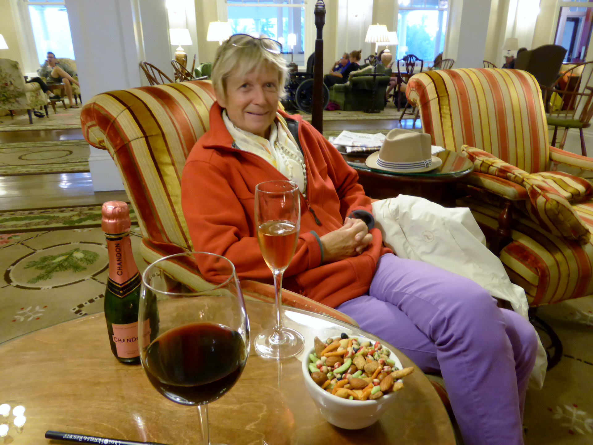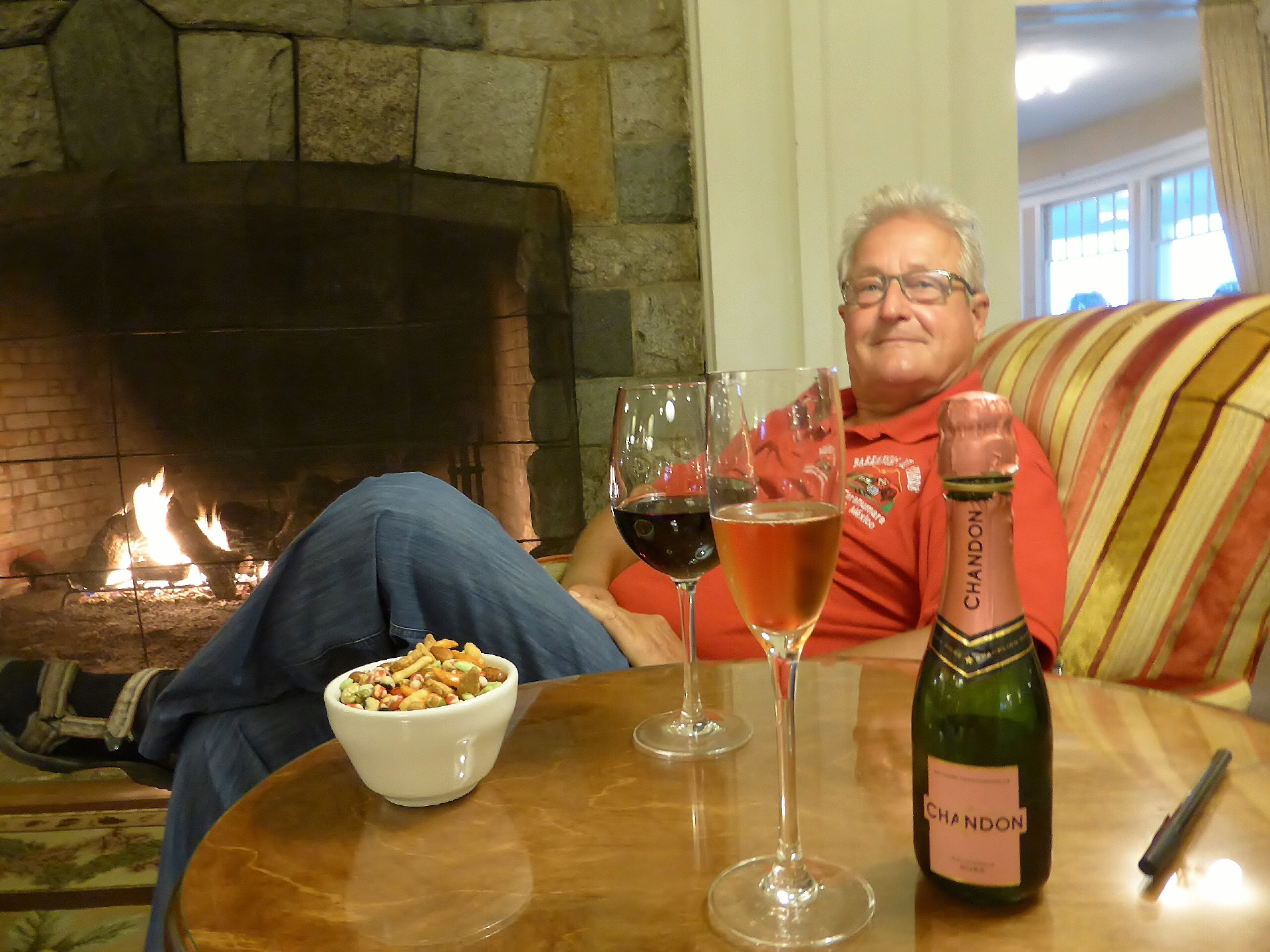 Geniessen einen Apéro in der Lobby am Kaminfeuer. Wir werden von einem Amerikaner angesprochen. Er zeigt uns auf seinem I-Phone ein Foto von uns auf der Überfahrt Hamburg-Buenos Aires. Er fragt: It’s you?‘ Wir bejahen. Es entsteht ein längeres, gutes Gespräch über unsere Reise. Er war auf dem Parkplatz, hat unseren MAN fotografiert, die Internetseite gesucht und dann an der Rezeption gefragt, wem der Camper gehört. Die hatten keine Ahnung und so ist der durch die Räume spaziert und hat Ausschau nach uns gehalten.