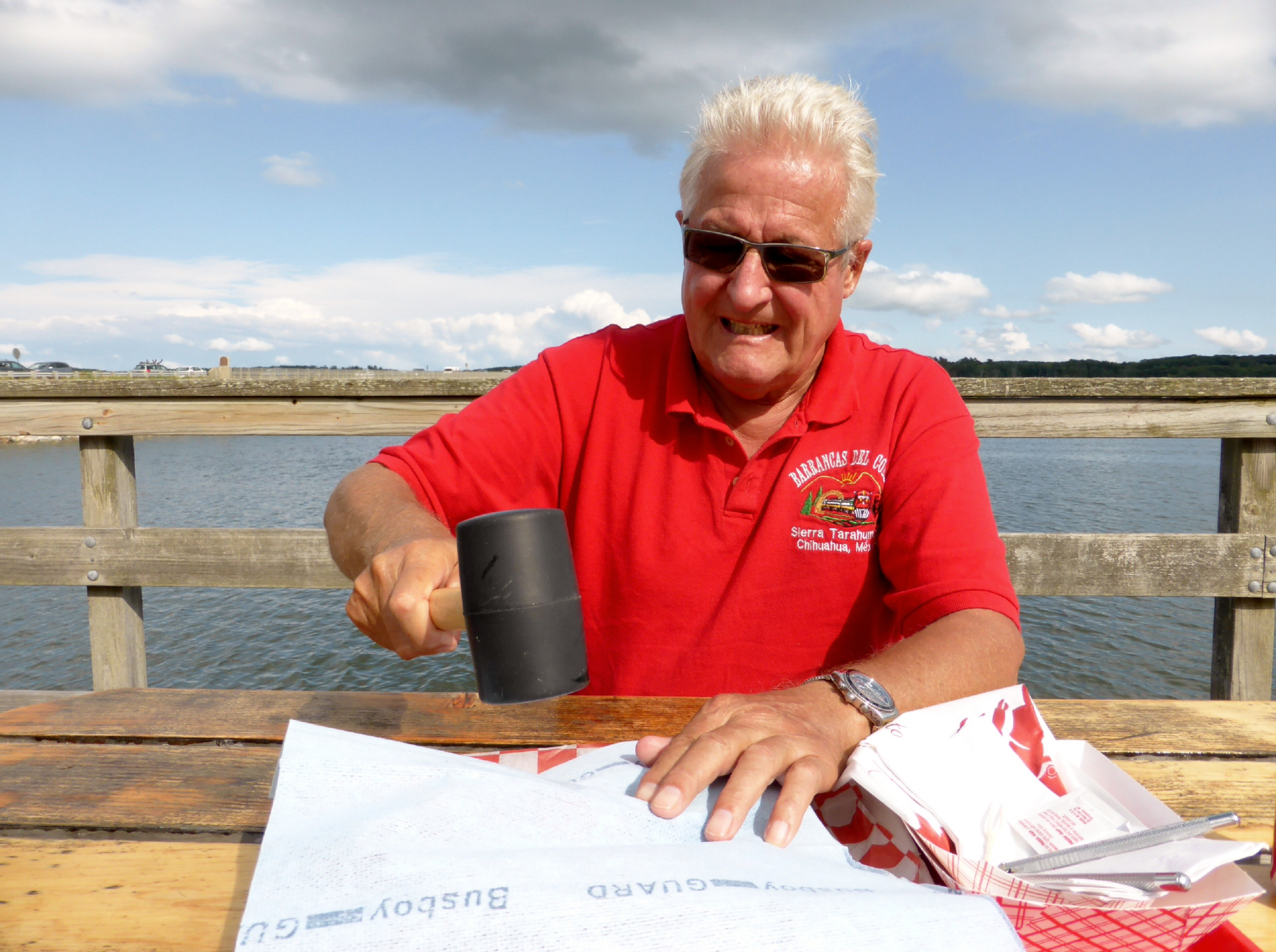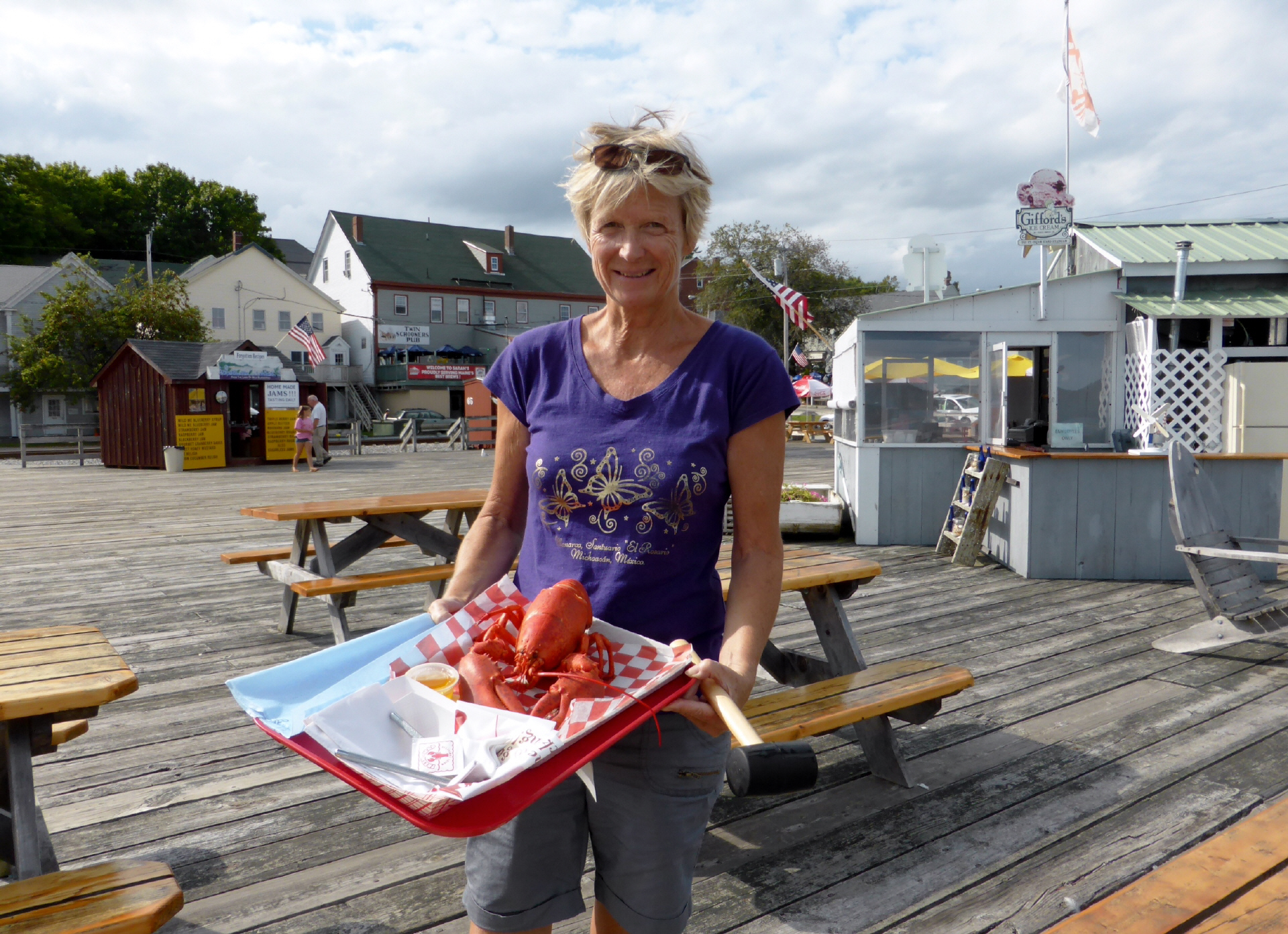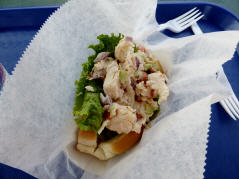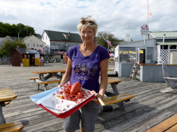 In ‚Maine‘ und an der Ostküste Canadas gibt es vor allem Lobster! Auch wir wollen einmal einen ganzen Lobster essen. Bestellen einen grossen Lobster. Diesen müssen wir selber aussuchen: 2,2 Pound für 34 $. Der arme Lobster wird lebend ins kochende Wasser (in einem Netz) gelegt und wir müssen warten. Nach 21 Minuten wird er nun in schönem Rot – beim Kochen hat er die Farbe geändert - auf ein Tablett gelegt. Zum Glück gibt es eine Gebrauchsanweisung und gegen ein Depot die nötigen Werkzeuge: Lobster-Zange, Häkchen, Hammer sowie Latz und Handwaschtüchlein. Gut ausgerüstet machen wir uns an die Arbeit resp. ans Essen. Schmeckt gut, ist aber eine Fresserei. In Zukunft werden wir uns wieder mit Lobster-Roll begnügen: ein getoastetes Brötchen gefüllt mit Lobsterfleisch, einem Salatblatt und manchmal Mayonnaise.