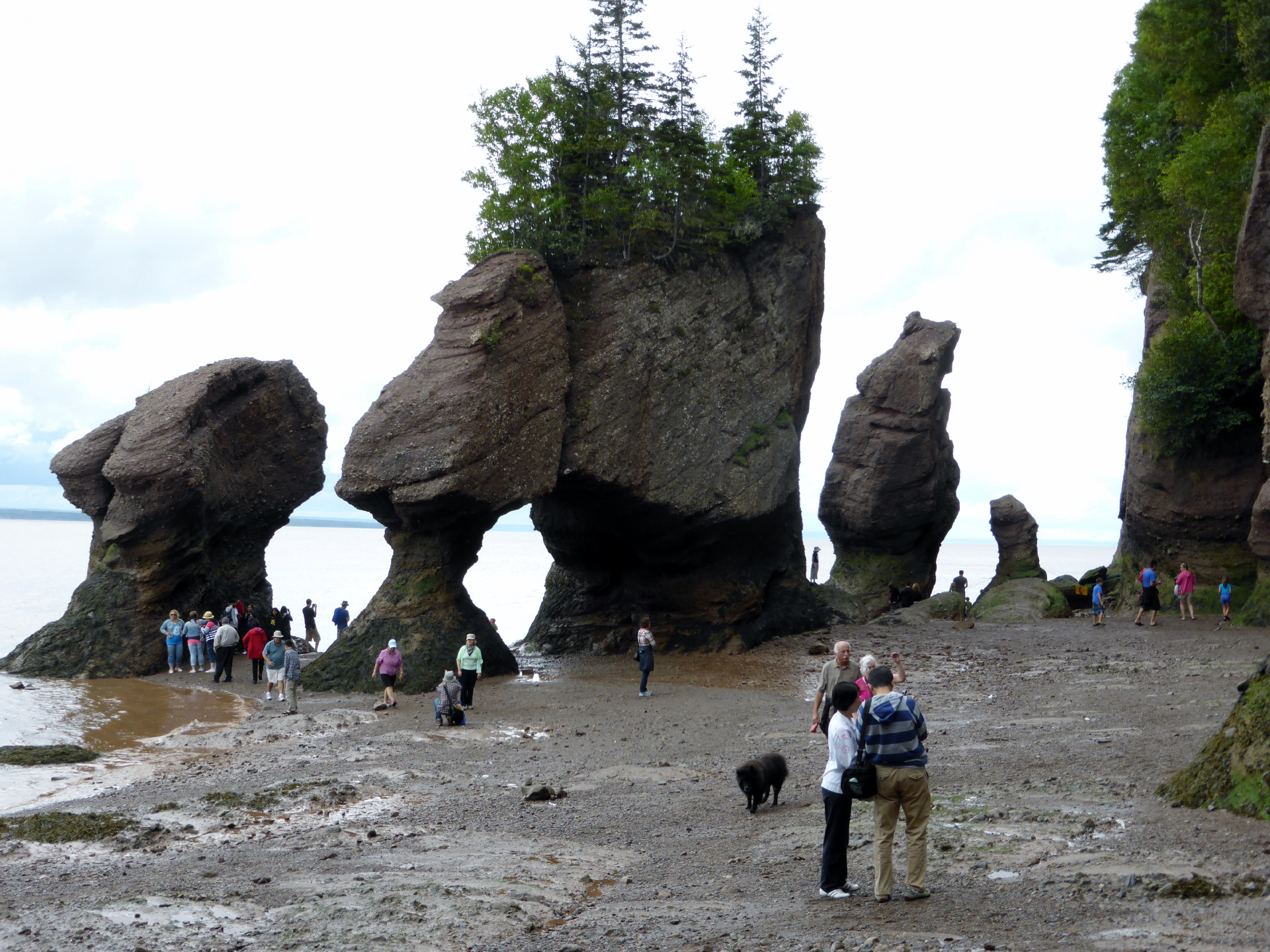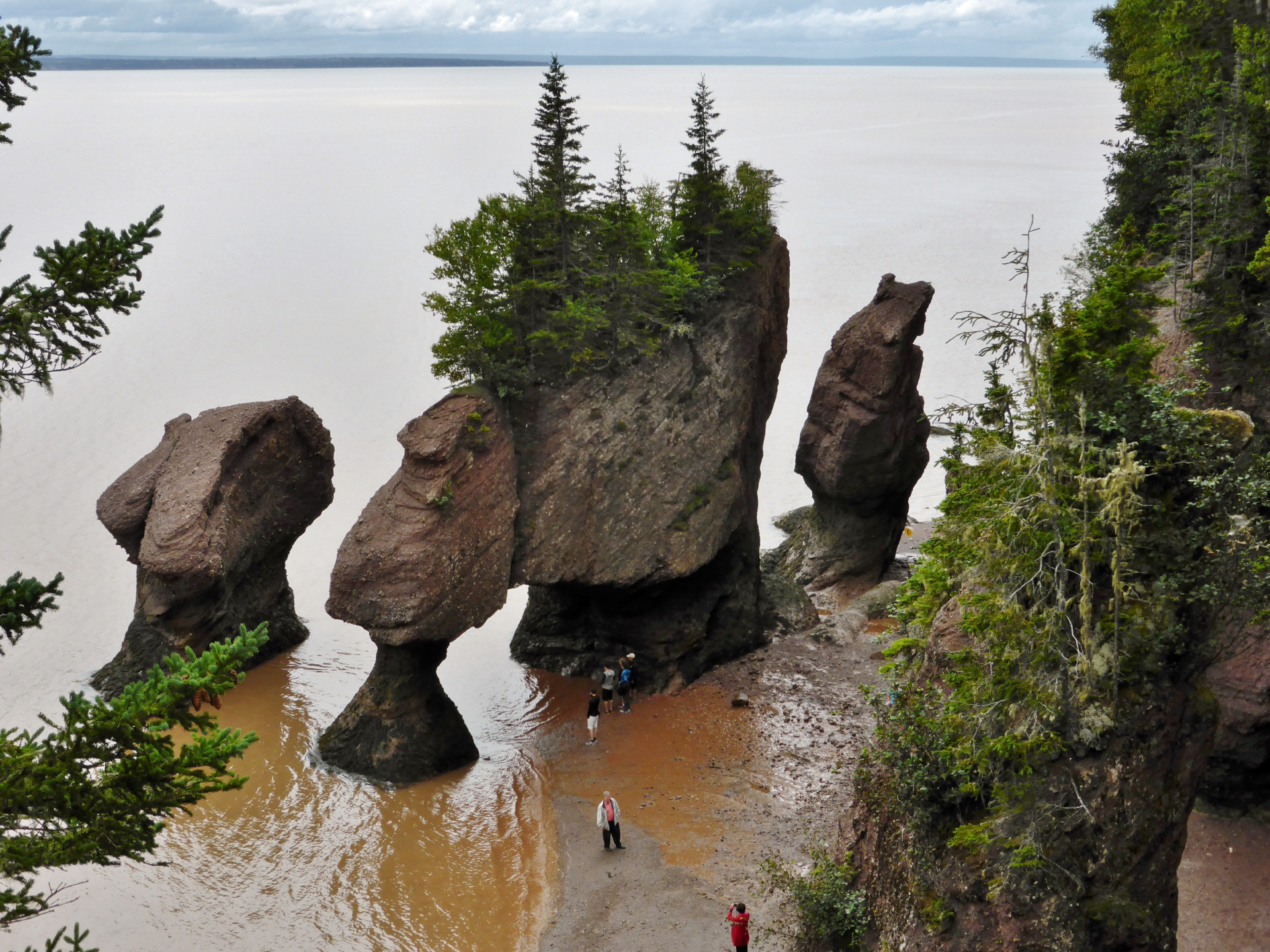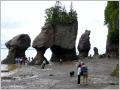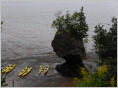 In ‚New Brunswik‘ führt die Küstenstrasse entlang der ‚Fundy Bay‘. Diese ist bekannt für die extrem hohen Gezeitenunterschiede - zwischen Ebbe und Flut kann es bis 12 m sein! Auch die Strasse ist eine reinste Berg- und Talfahrt (16 % - dies ist für uns eine anstrengendes Schalten und betätigen der Motorbremse. Die ‚Hopewell Rocks‘ – auch Blumentöpfe genannt – ragen bei Flut aus dem Wasser. Bei Ebbe kann man sie von unten, vom Meeresboden aus bestaunen oder mit dem Kanu umrunden. Damit die Touristen nicht vom der Flut überrascht werden, sind überall gross die Gezeitentabellen notiert.