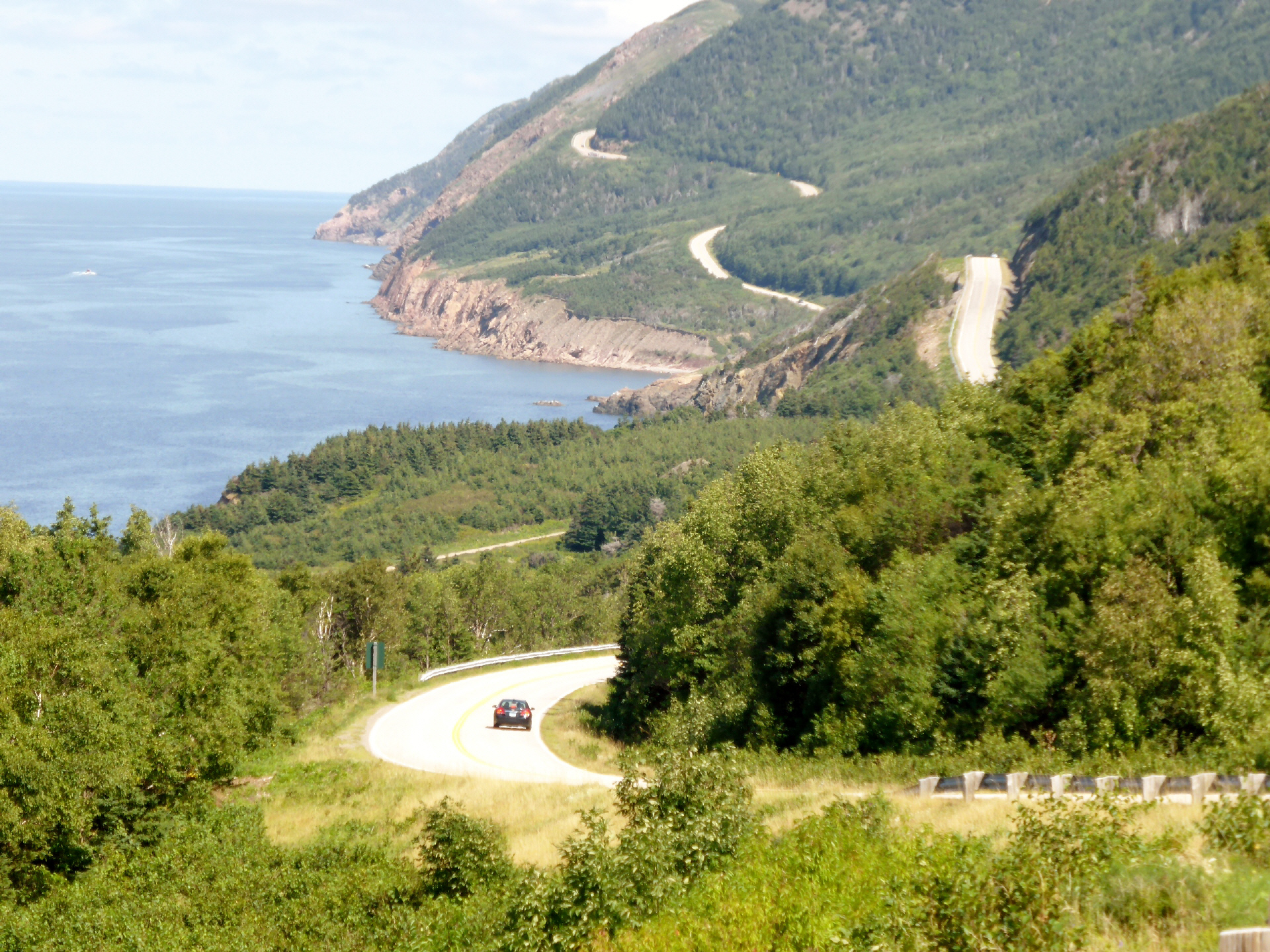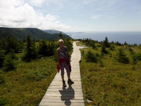 Fahren im Uhrzeigersinn um das ‚Cape Breton‘ in den Nationalpark. Wir folgen der gut ausgebauten Panoramastrasse ‚Cabot Trail‘. Wandern zwei Stunden den ‚Skyline Trail‘. Hier soll es Bären und Moose (Elche) geben. Ein grosses Tier hat am Wegrand sein Geschäft verrichtet, ansonsten halten sie sich bedeckt. Am Schluss führt der Trail über einen breiten Bretterpfad mit 284 Stufen. Belohnt werden wir mit einer schönen Aussicht auf den ‚Gulf St. Lawrence‘.