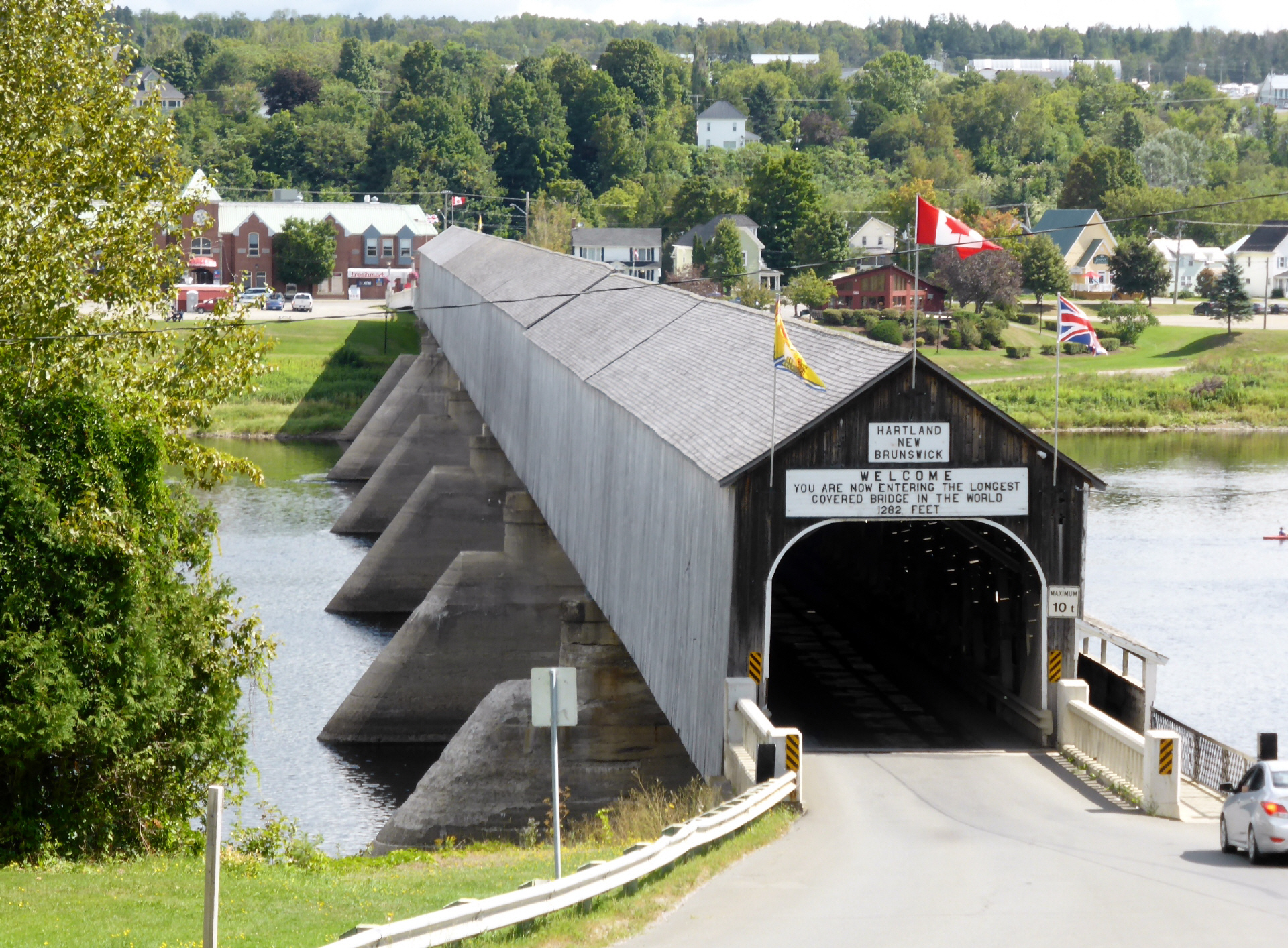 In ‚Hartland‘ steht die längste, überdachte Holzbrücke der Welt – ca. 500 m! Sie ist einspurig zu befahren. Der Schnellere ist der Geschwindere. Es gibt kein Lichtsignal. Es kann schon mal vorkommen, dass ein Fahrer in der Mitte der Brücke den Rückwärtsgang einlegen muss.